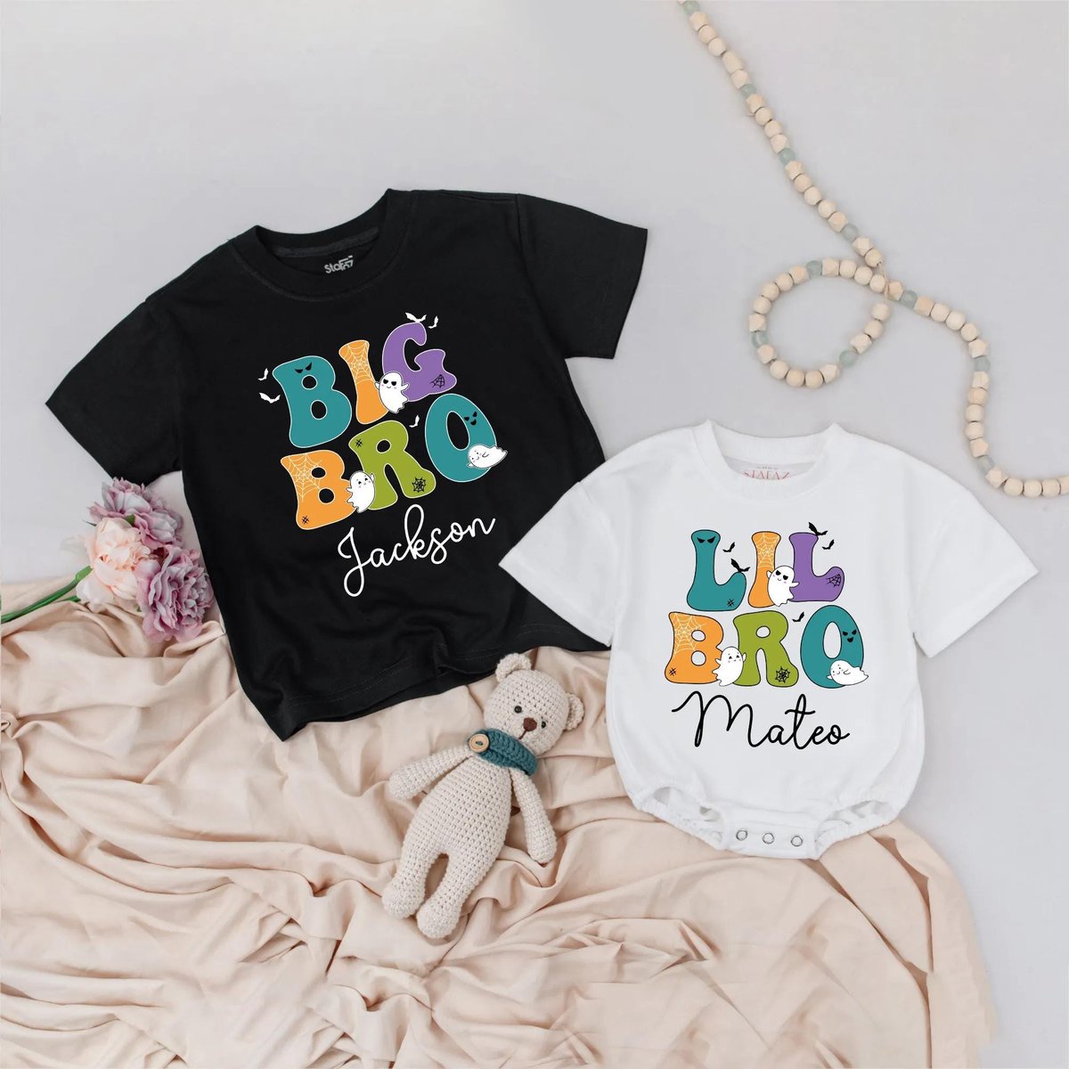 Custom Name Halloween Sisters Bubble Romper Matching Ghost Tees For Big and Little Sister Spooky Gir