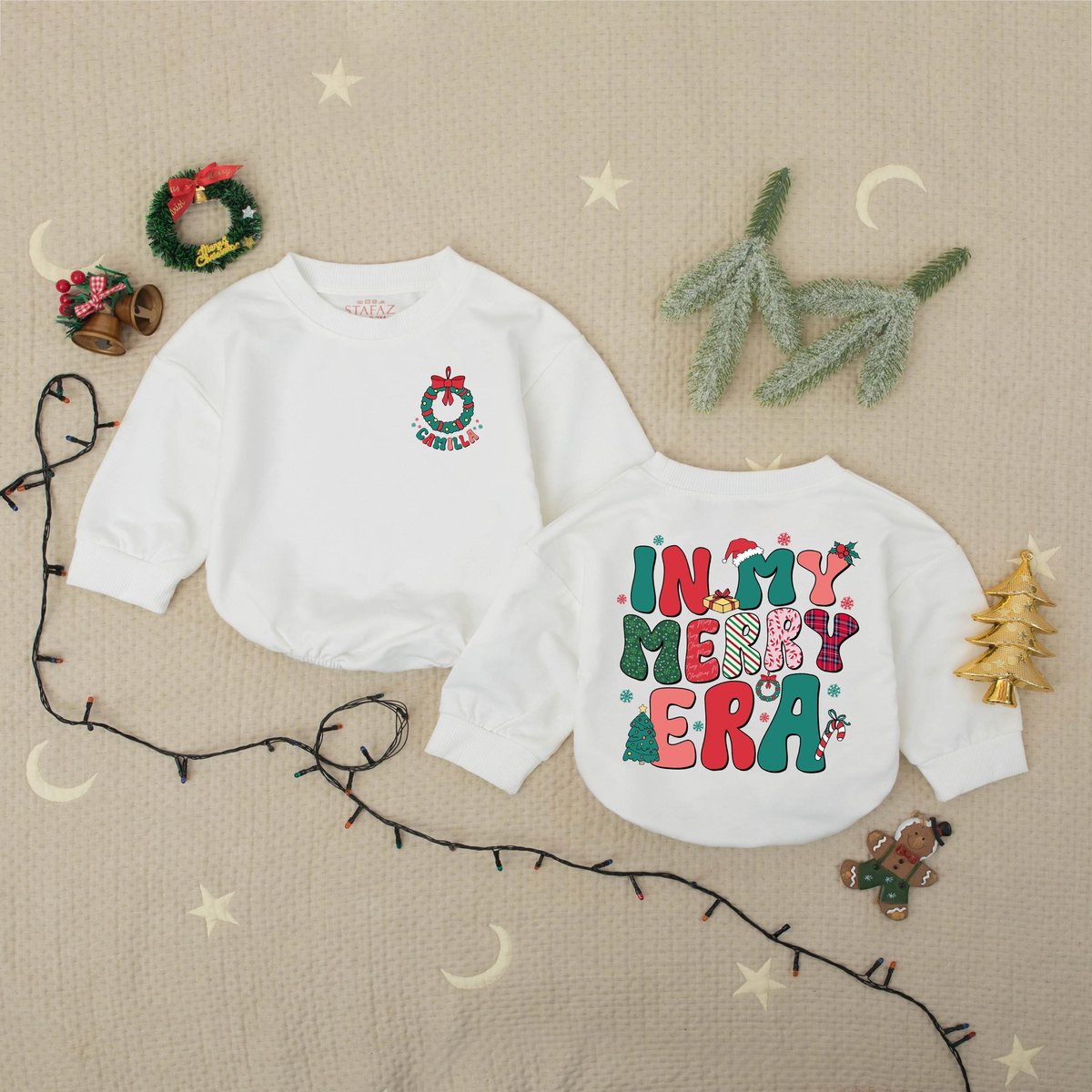 Custom Name In My Merry Era Bubble Romper Funny Christmas 2025 Baby Romper Holiday Group Matching Ba