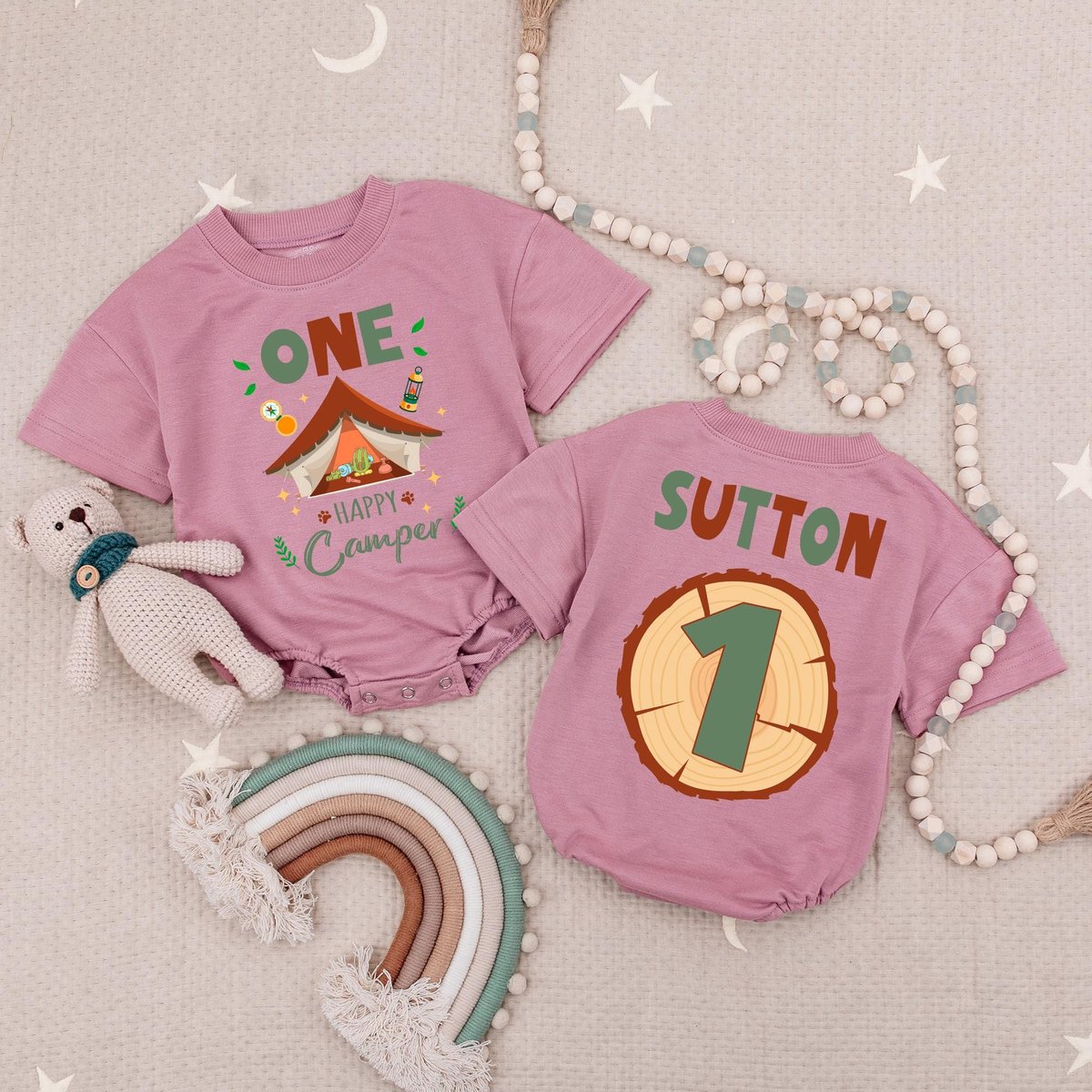 Custom Name One Happy Camper Birthday Bubbler Romper 1st Camping Birthday Boy Baby Romper Happy Camp