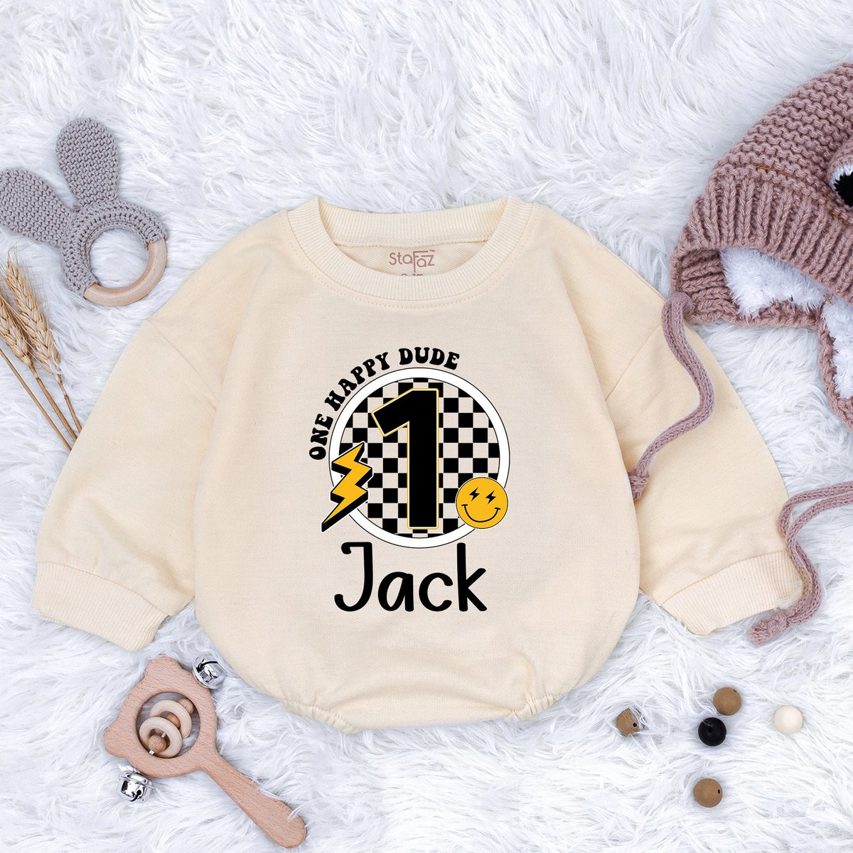 Custom Name One Happy Dude Birthday Baby Romper Smiley Face Birthday Outfit 1st Birthday Baby Bodysu