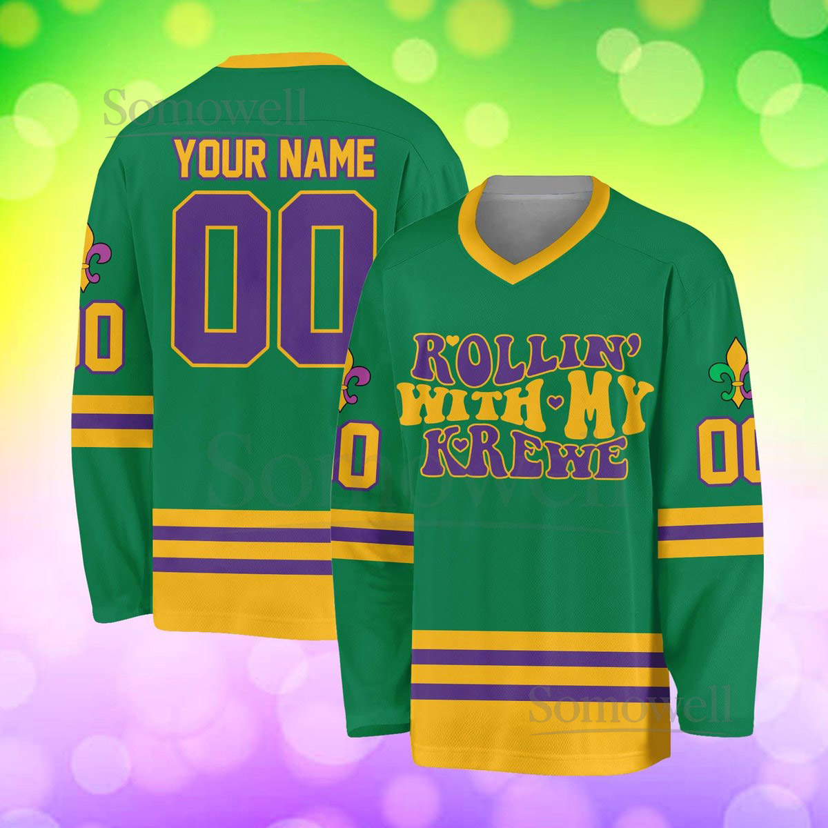 Personalized Mardi Gras Hockey Jersey Custom Name Number Rollin with My Krewe Jersey Hockey Jersey Uniform For Hockey Fans_279