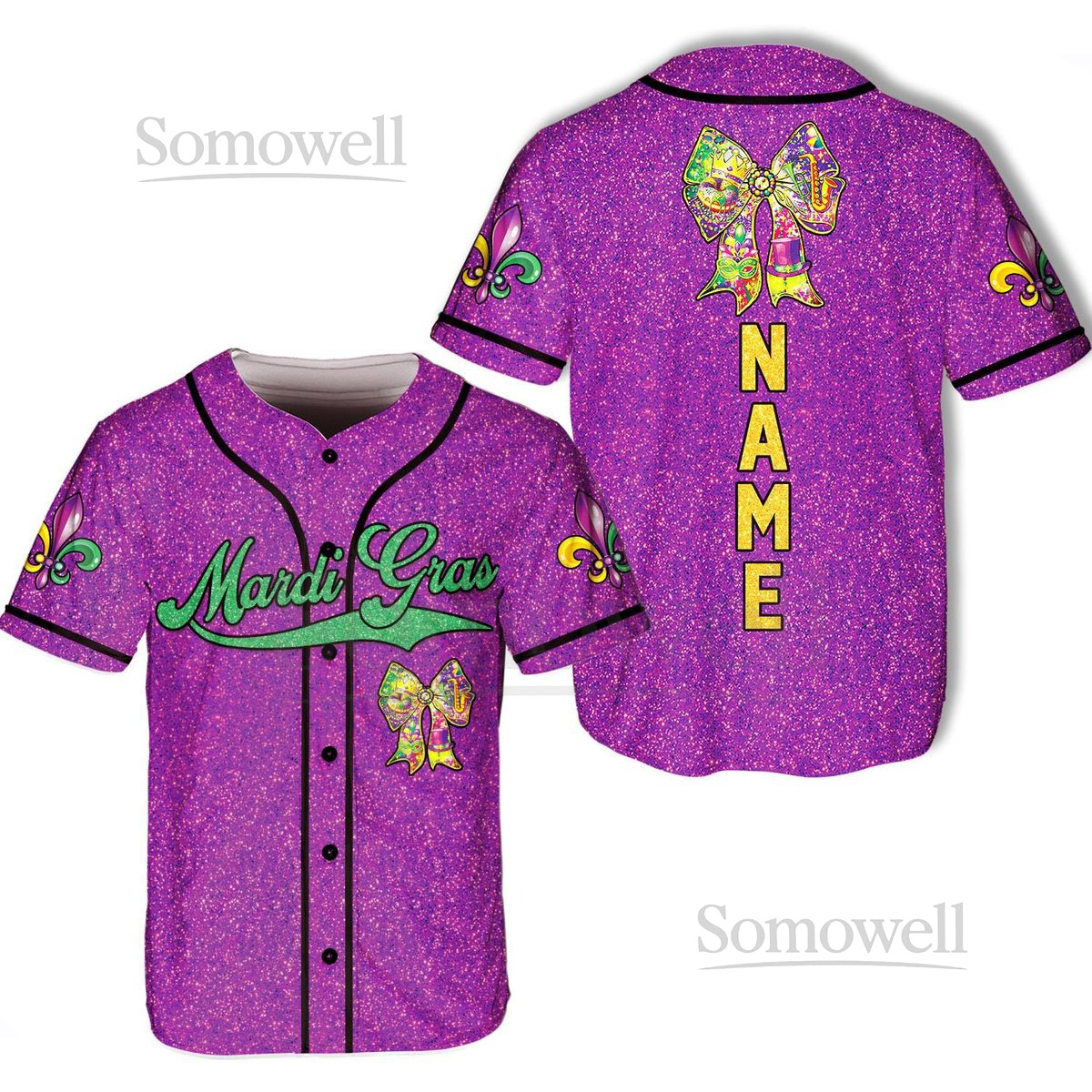 Personalized Mardi Gras Glitter Baseball Jersey Custom Name Number Bow Ribbon Mardi Gras Jersey Printed Glitter Not Glitter Fabric_270