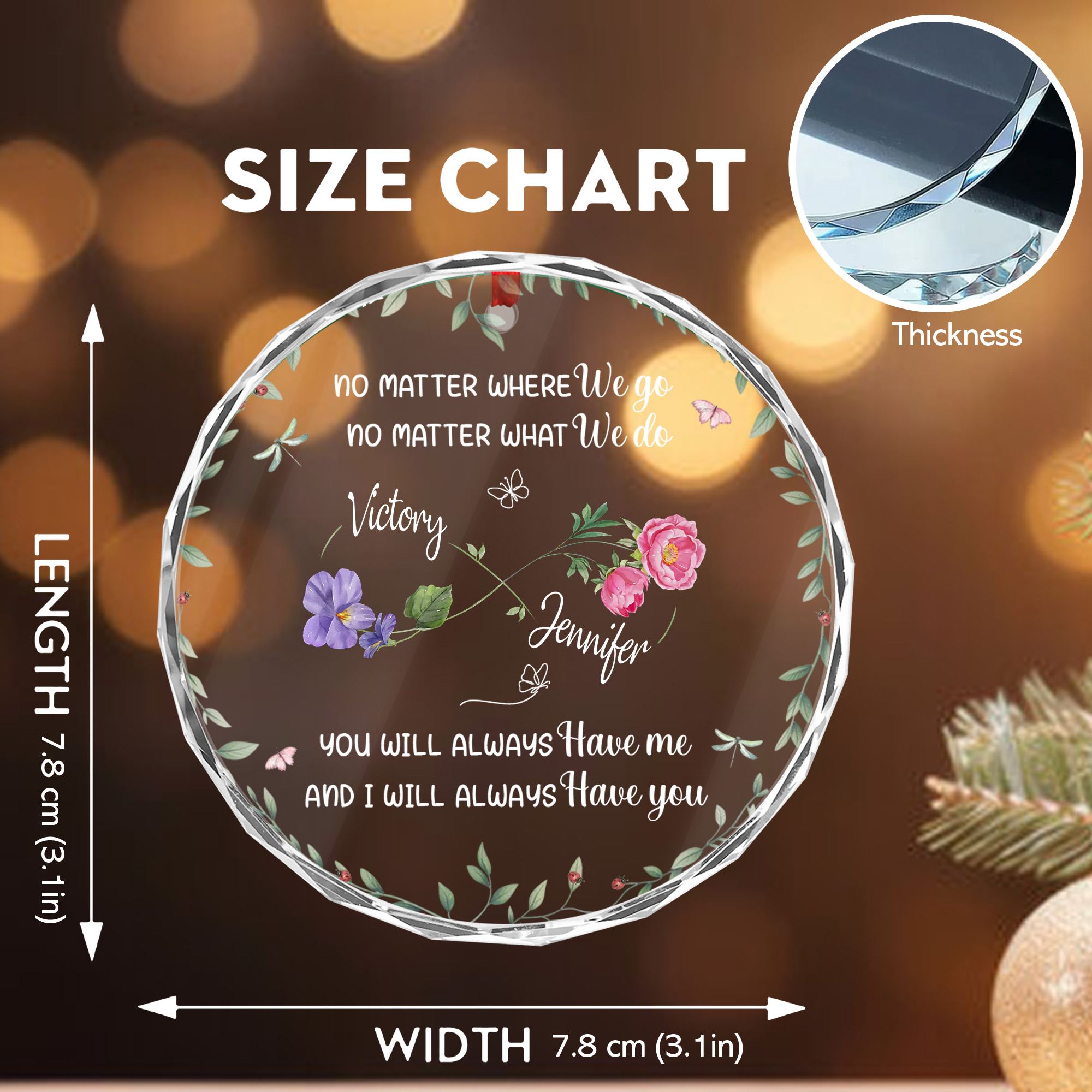 $18.95Personalized Best Friends Forever Ornament – Faceted Glass with Flowers – Christmas Gift for Besties 2025-GLO-S25A2 Product Details: Thickness: 8mm Dimensions: 3×3 in (7.8×7.8 cm). Please allow slight variations (0.4-0.6 in) due to manual measurement. Material: Crafted from 100% clear glass with beveled edges for a sleek, polished look. Features: One-sided, vibrant UV-printed design that […]