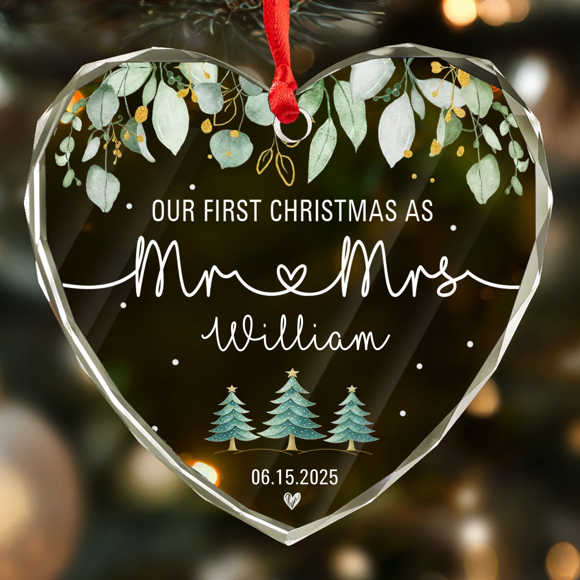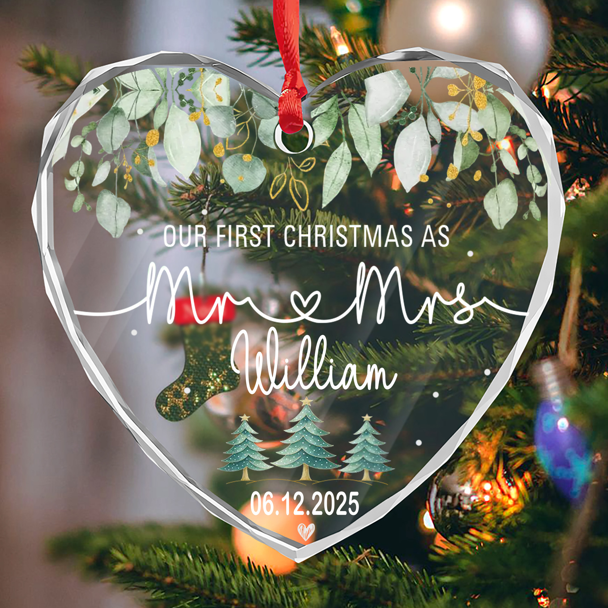 Personalized Mr & Mrs Ornament with Date – Faceted Glass Heart – Our First Christmas Gift for Couples 2025-HGLO-JDOSU