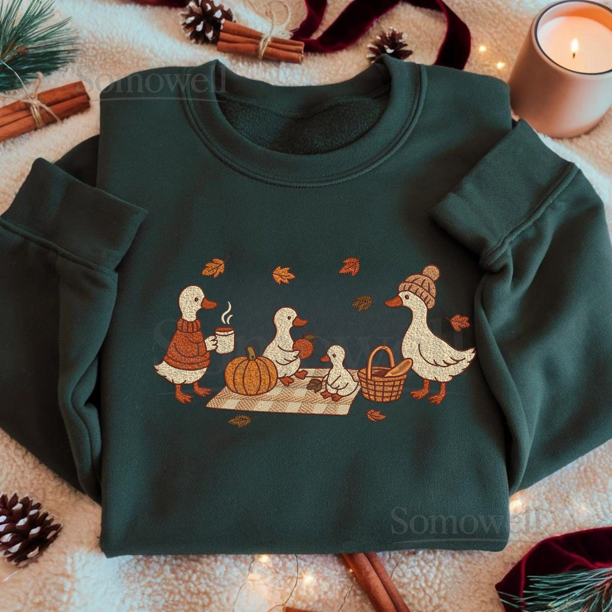 Autumn Duck Family Embroidery Sweatshirt Fall Pumpkin Sweater Cozy Season Crewneck Cute Duck Coffee Embroidered Shirt Gift_7