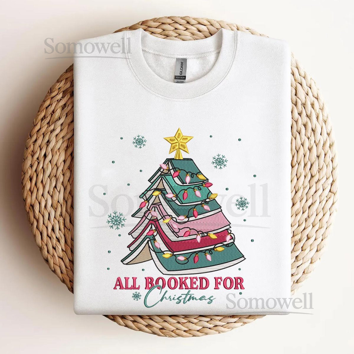 EMBROIDERED All Booked For Christmas Shirt Christmas Books Tree Shirt Bookish Embroidery Sweatshirt Merry Christmas Teacher T-shirt_55
