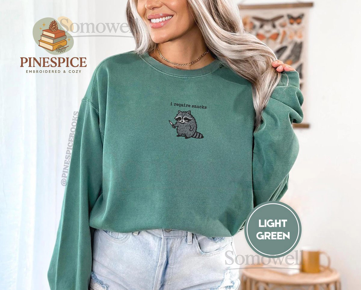 I require snacks sweatshirt embroidered raccoon sweater comfort colors 1566 funny cozy sweatshirt snack lover gift feral unhinged_110