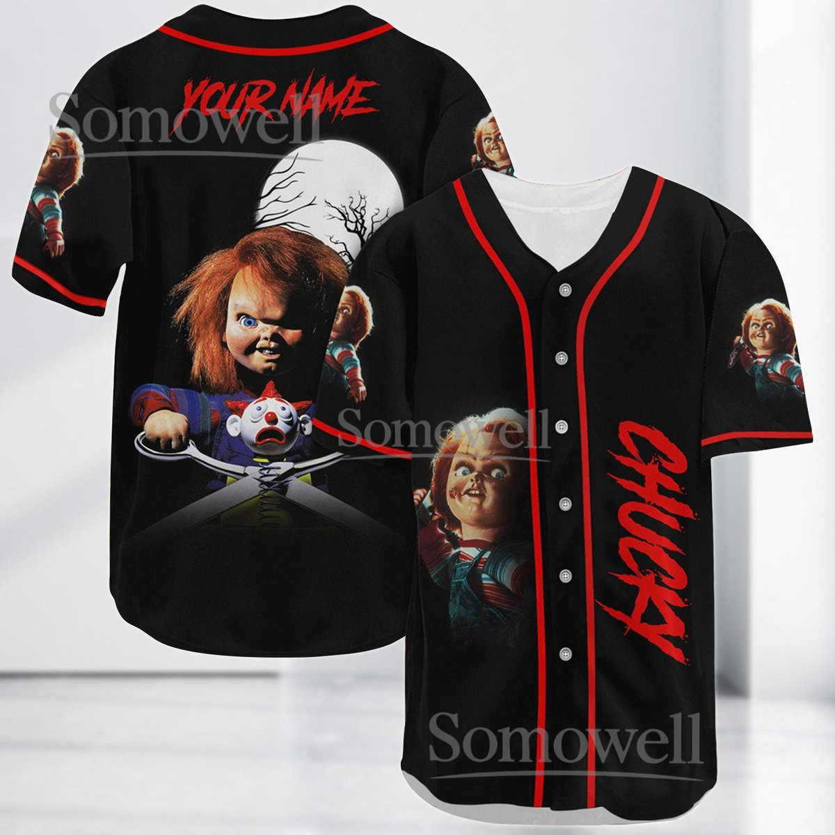 Chucky Horror Movie Baseball Jersey with Iconic Character and Gory Design
