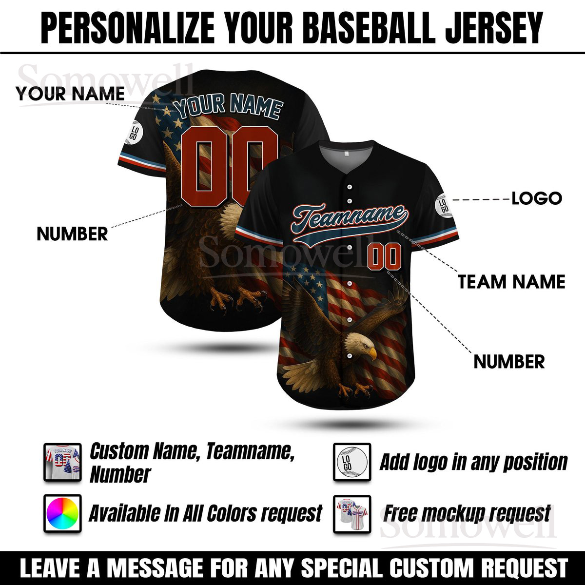 Personalized American Eagle Baseball Jersey Custom Team Name and Number Patriotic Sports Shirt for Men Women and Youth