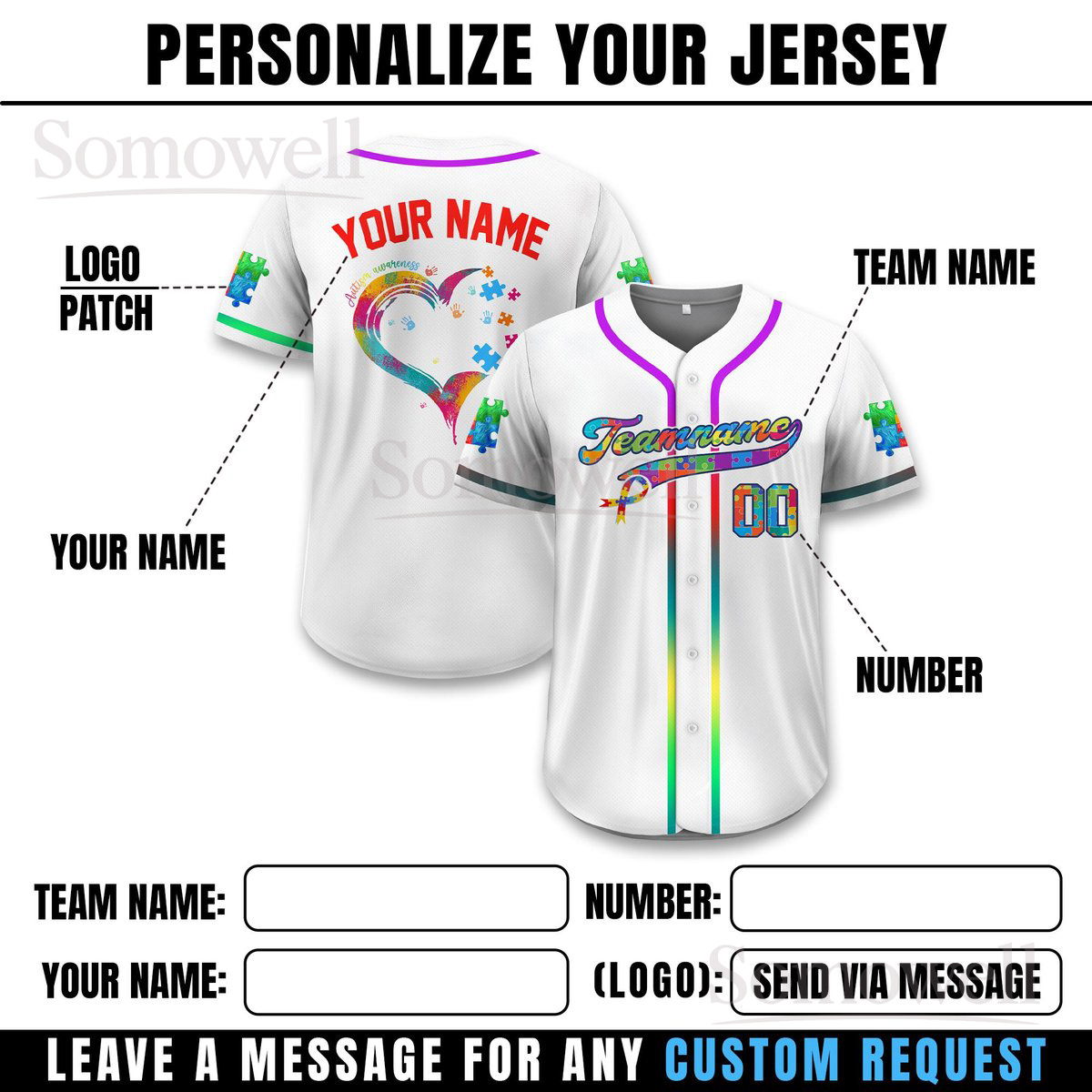 Personalized Autism Awareness Baseball Jersey Puzzle Heart Custom Team Name Number Shirt Multi Color Edition