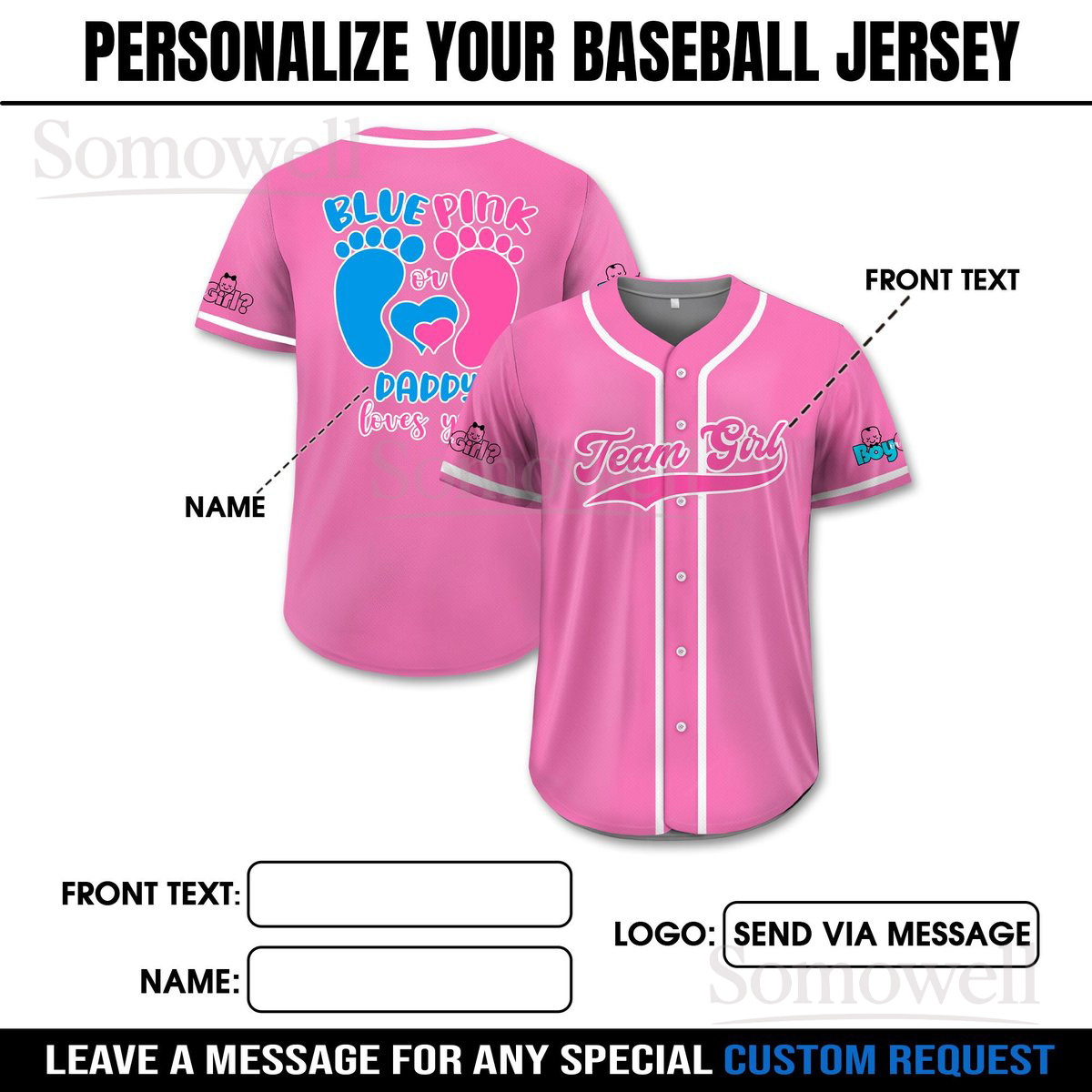 Personalized Baby Reveal Baseball Jersey for Men, Women, and Kids with Custom Name and Number in Multiple Colors