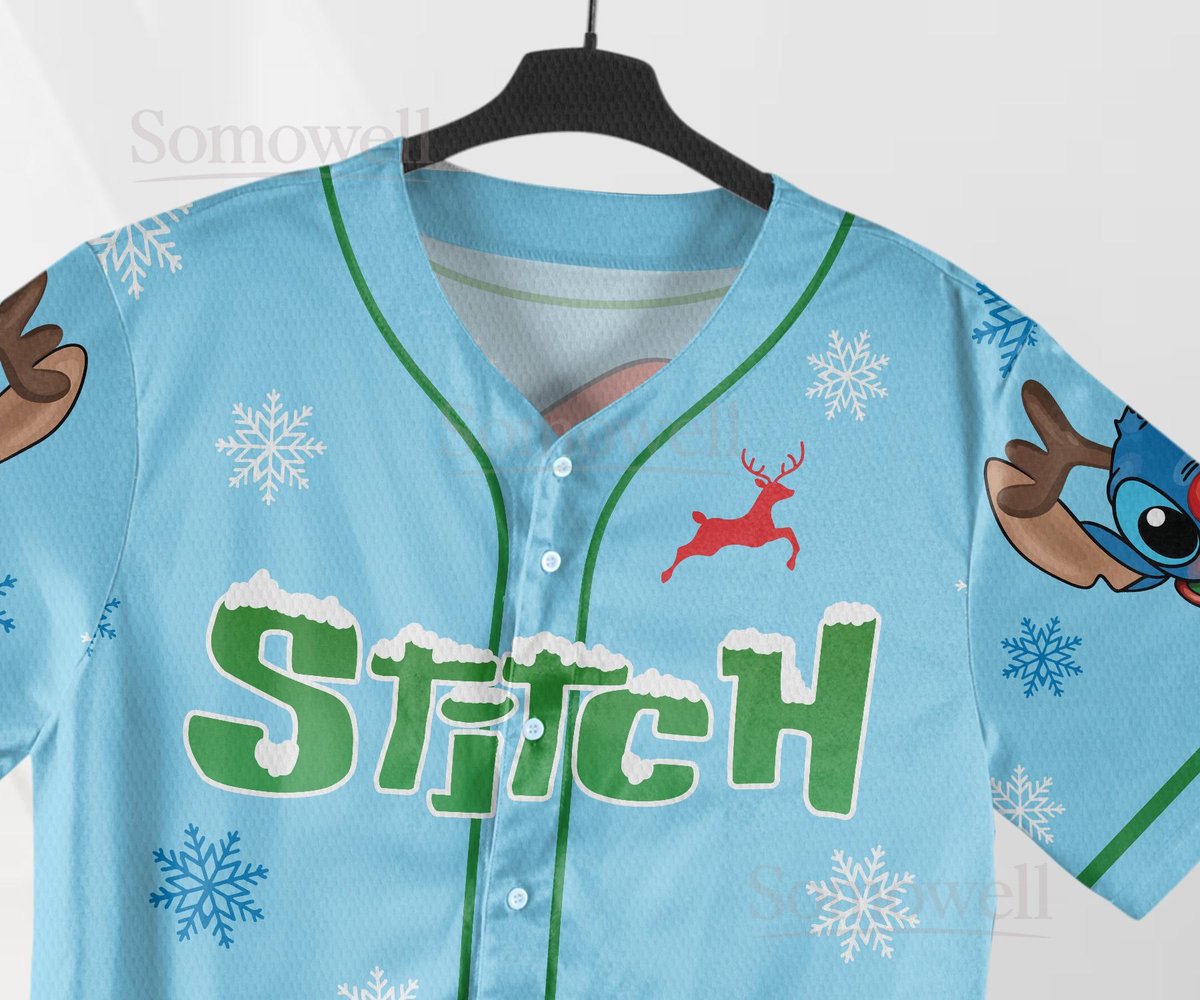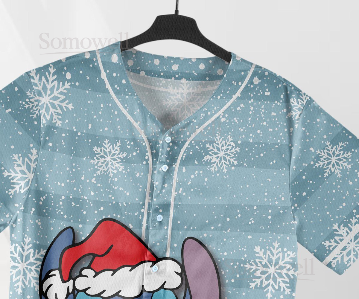 Custom Stitch Christmas Baseball Jersey Shirt for Disney Fans Blue Winter Holiday Cartoon Gift Apparel