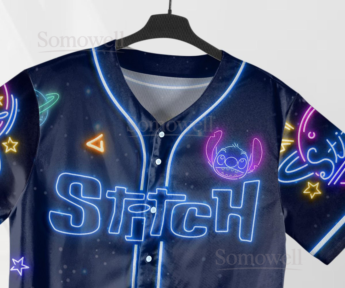 Custom Stitch Neon Baseball Jersey Shirt for Disney Fans Glow in the Dark Blue Cartoon Design Gift Apparel