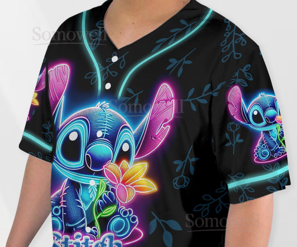 Custom Stitch Neon Baseball Jersey Shirt for Disney Fans Black Glow in the Dark Cute Cartoon Gift Apparel