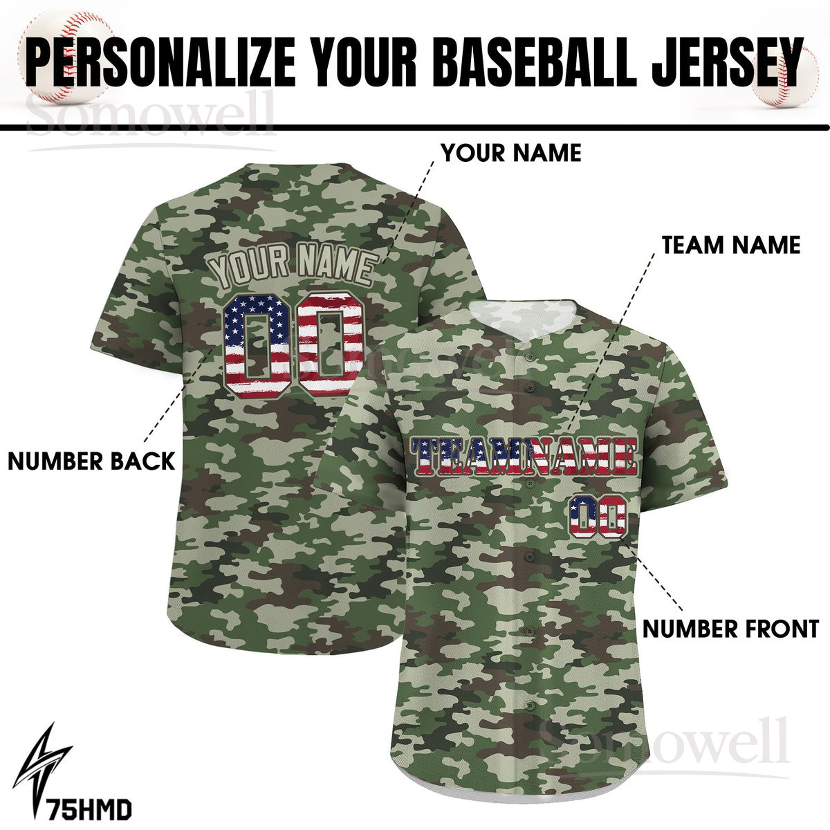 Custom Printed Camo Baseball Jersey Shirt Personalized with Team Name and Number for Sports Fans Green Military Style