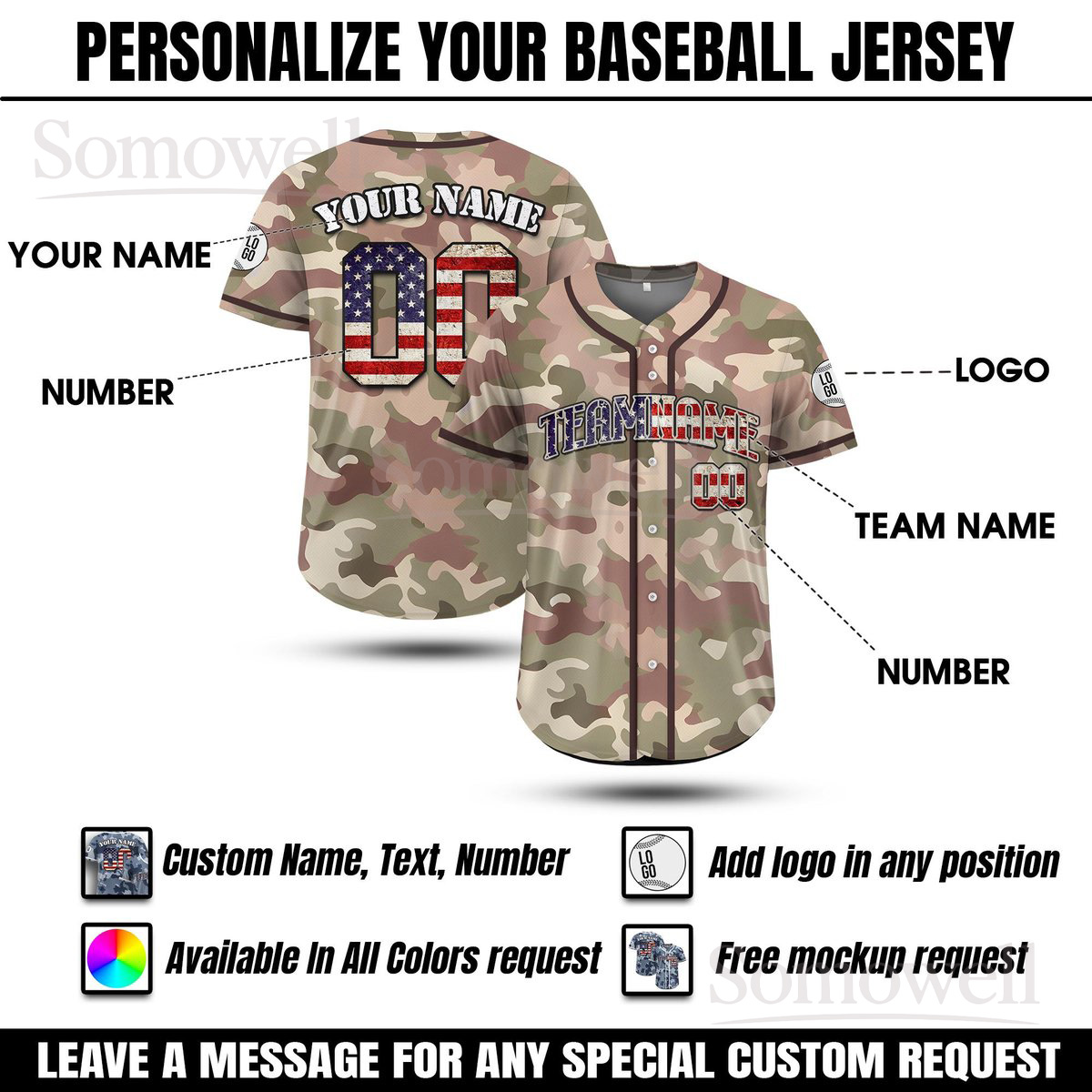Custom Name Camo Baseball Jersey Personalized Team Uniform with Flag Print Multi Color Edition