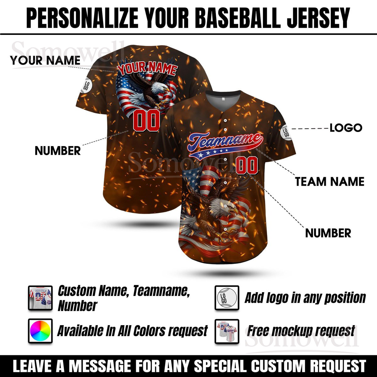 Custom Name Eagle American Baseball Jersey Personalized Team Name Number 4th of July Patriotic Family Matching Outfit Multi Color Edition