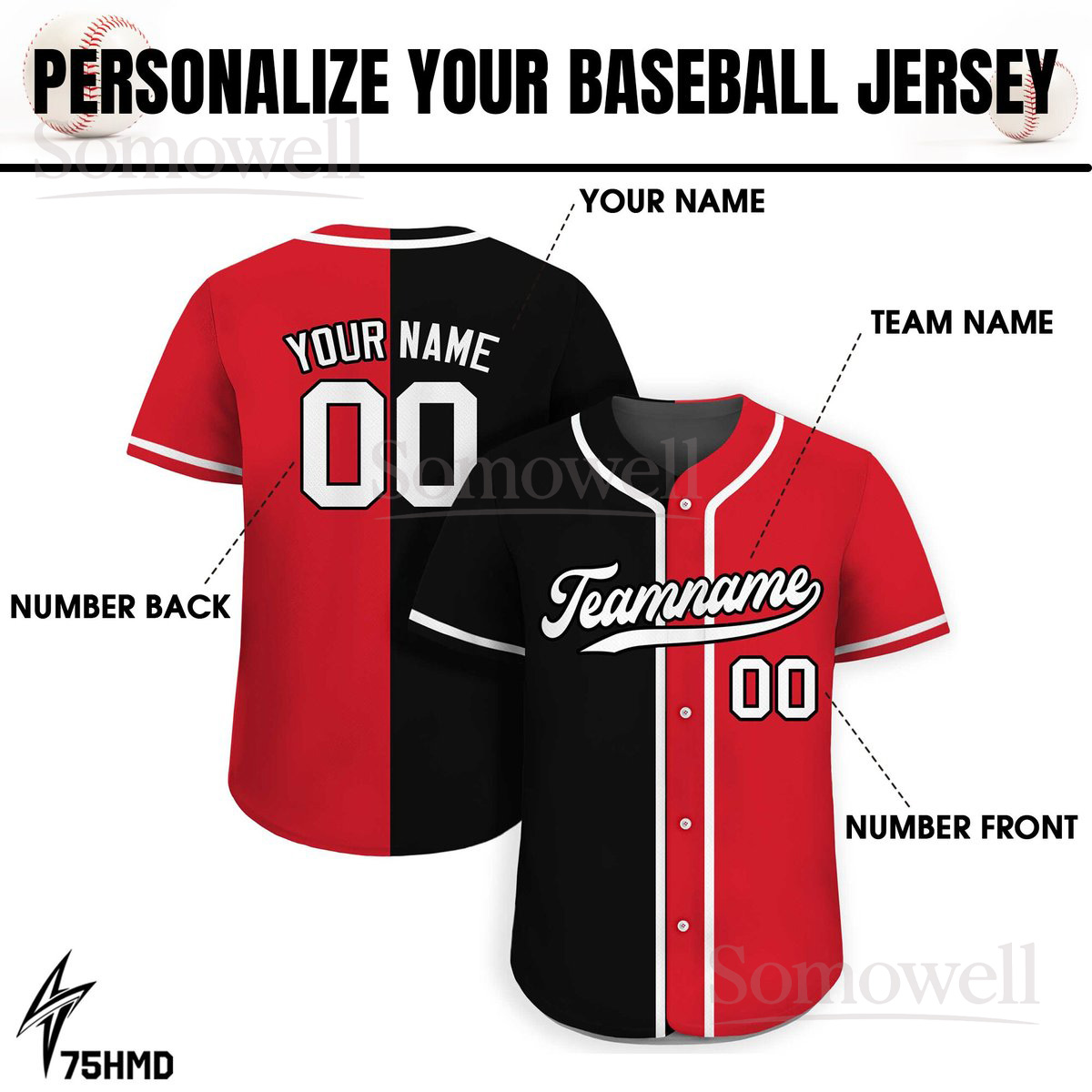 Custom Baseball Jersey Personalized Team Name Number Split Color Half Red Half Black Design for Adult Youth Multi Color Edition