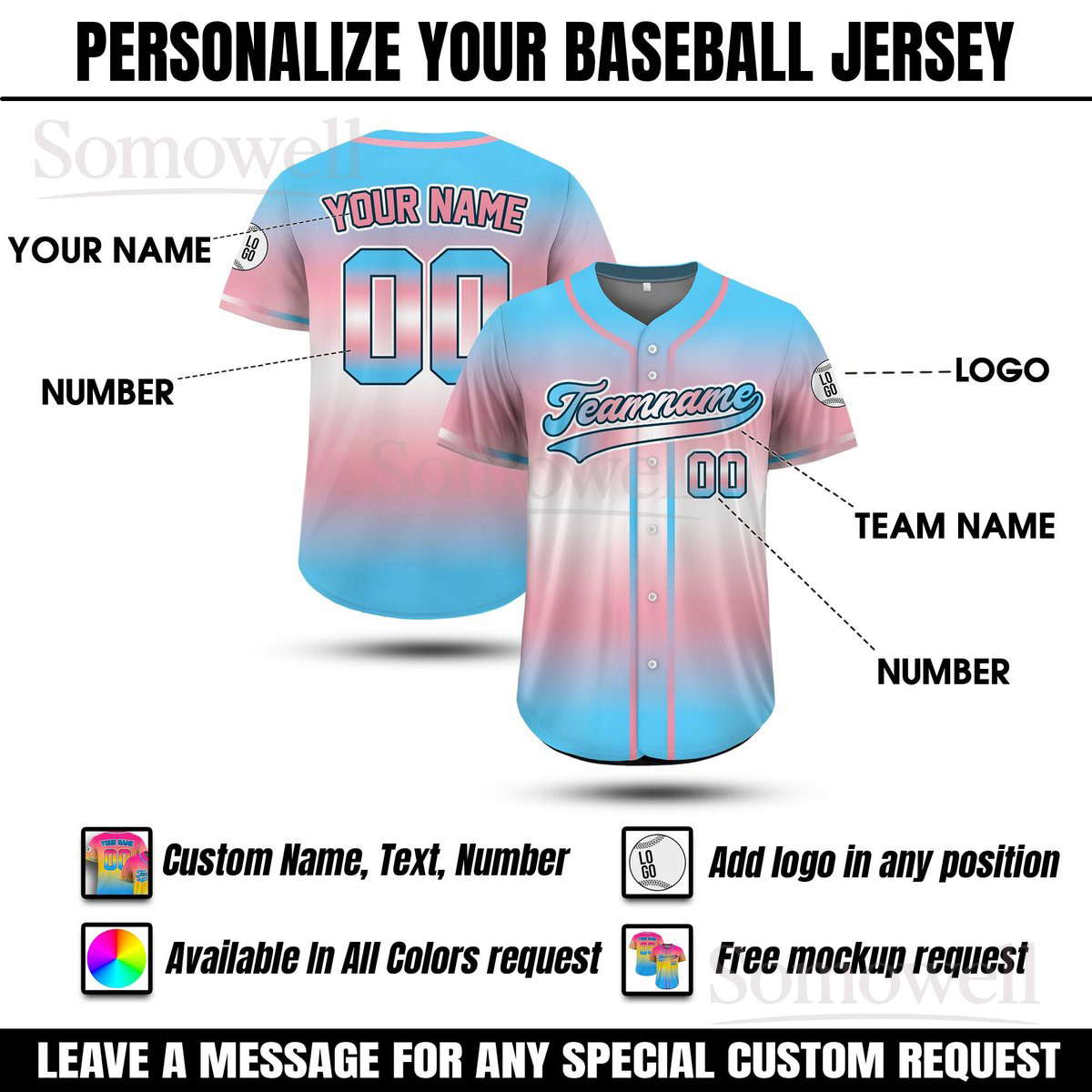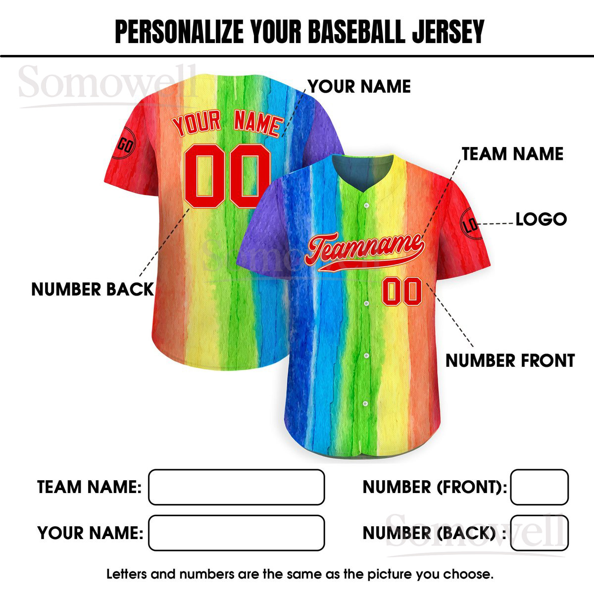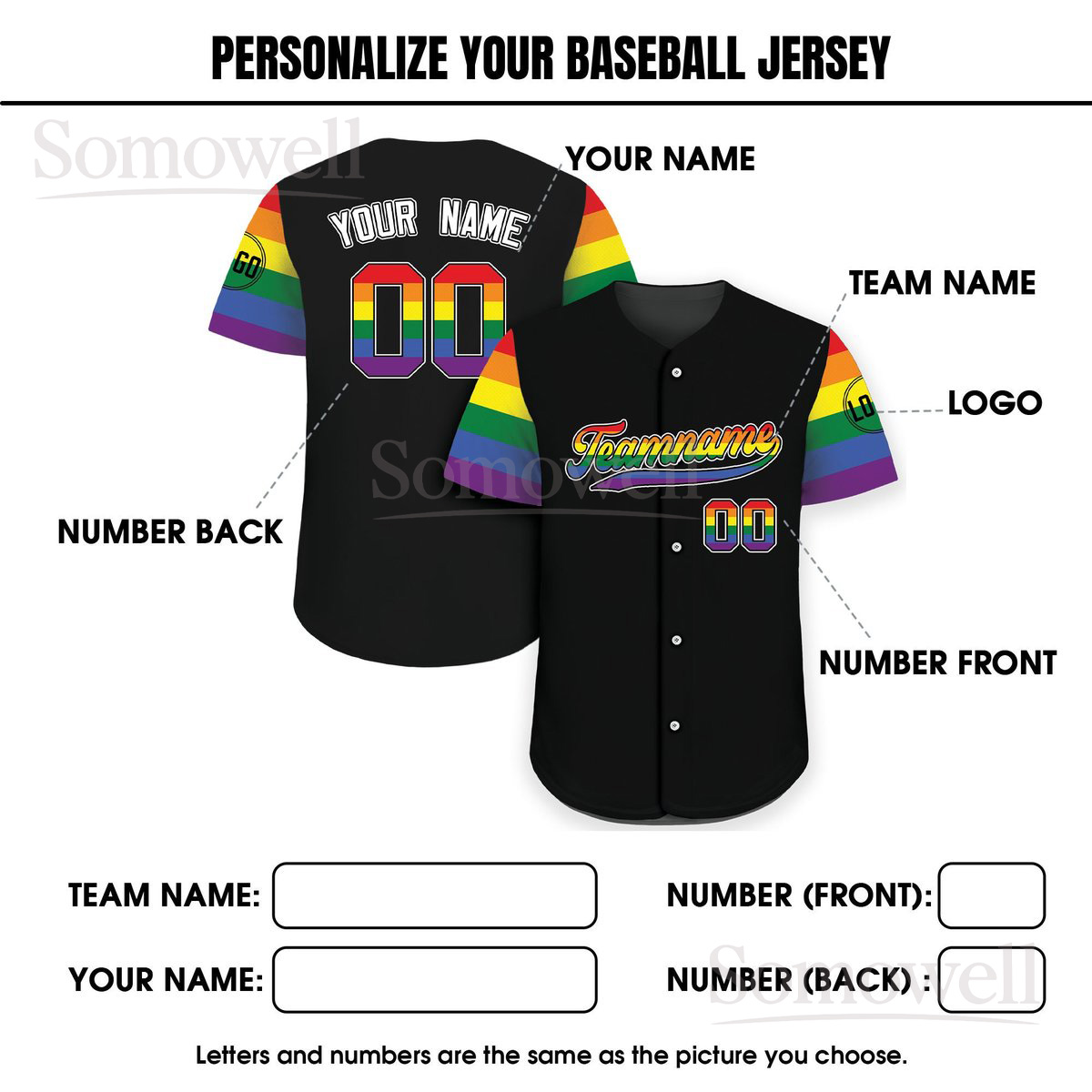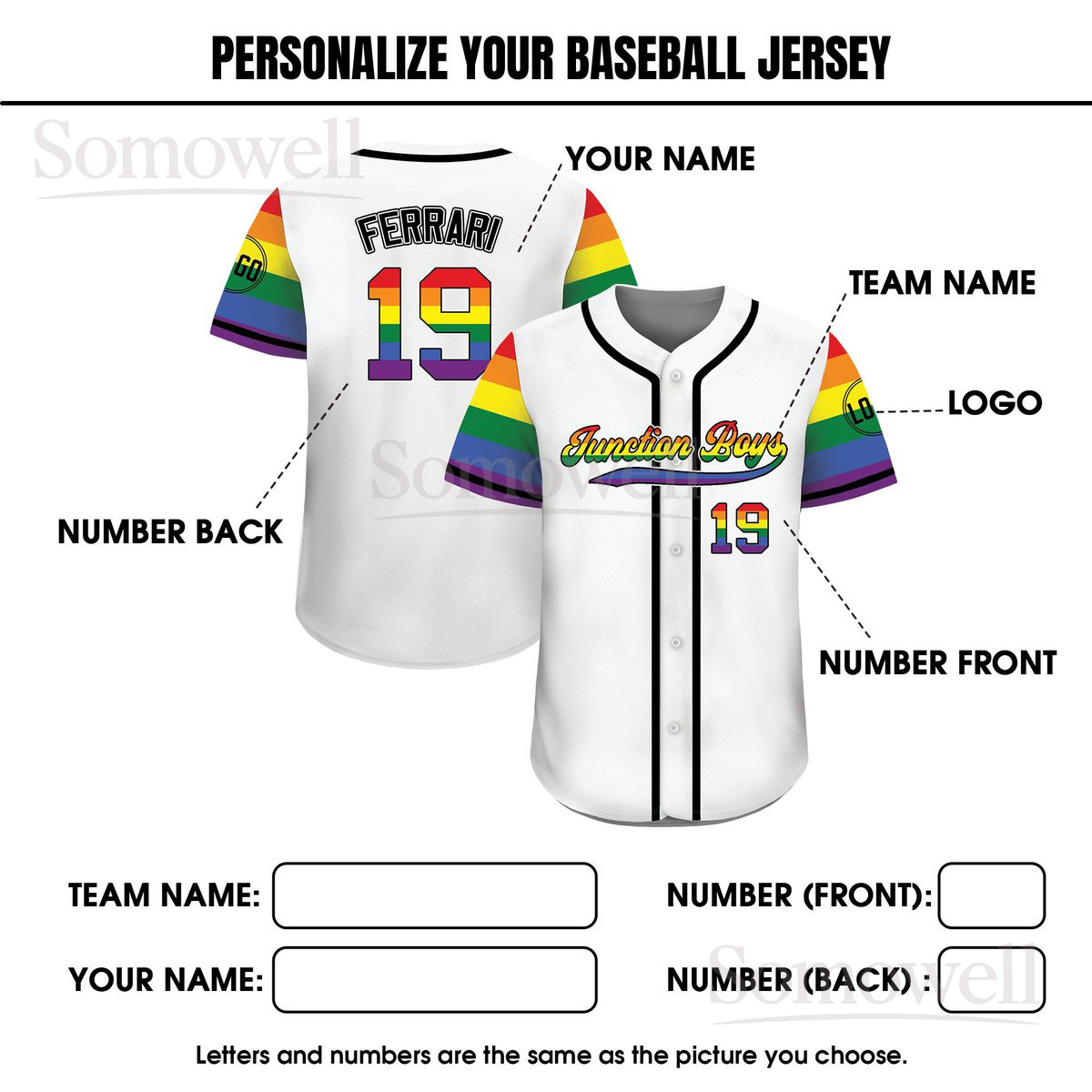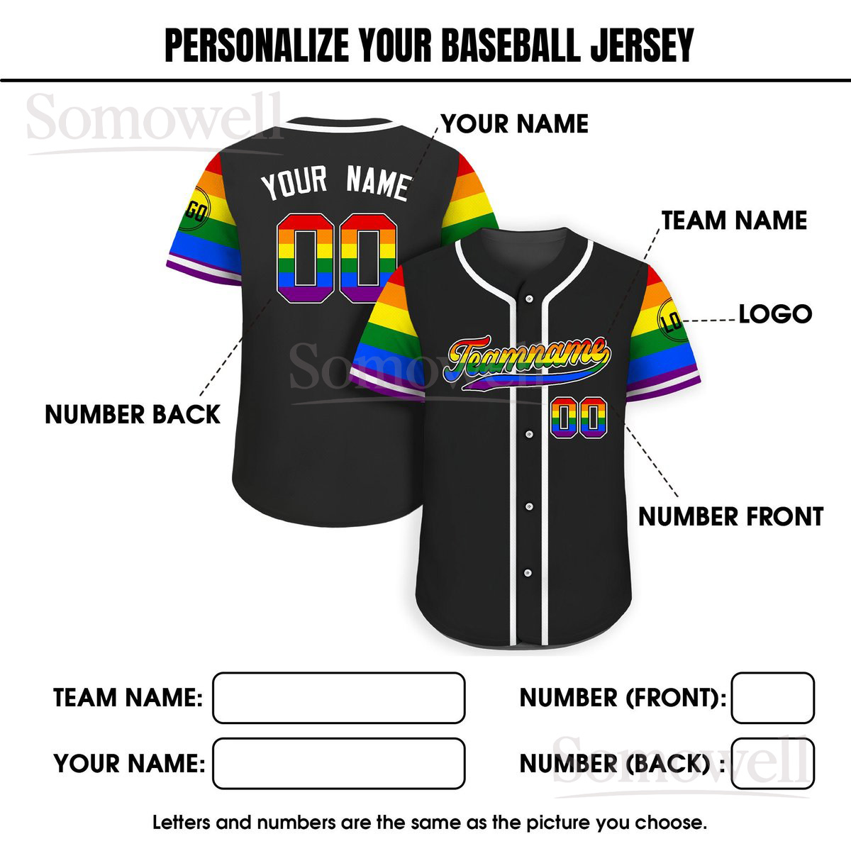 Custom LGBTQ Pride Month Baseball Jersey with Teamname Name and Number for Men and Women in Multiple Colors