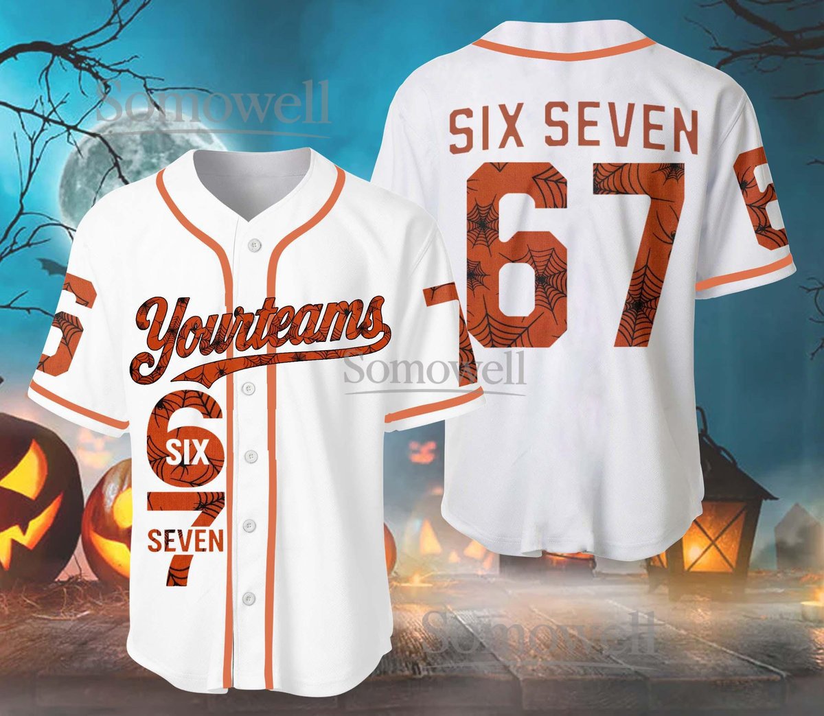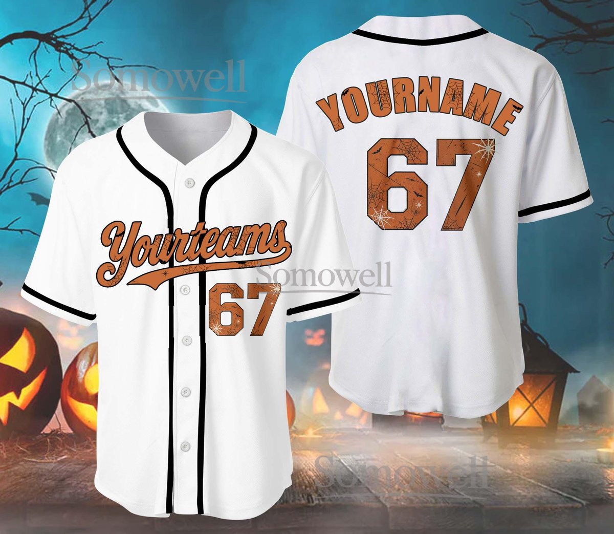 Custom Halloween Baseball Jersey with Spider Web Design and Number 67 Available in Multiple Colors