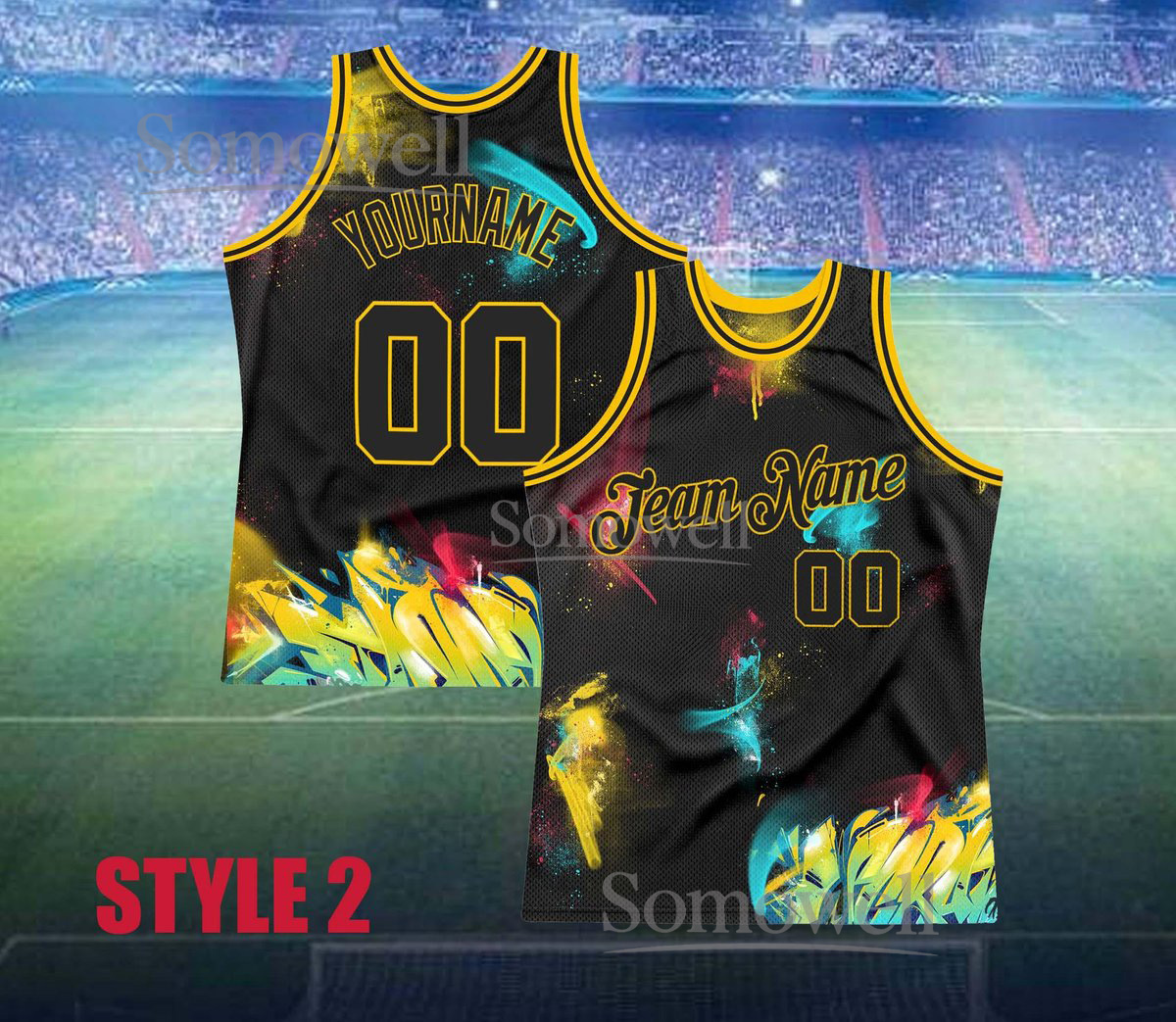 Custom Graffiti Basketball Jersey with Personalized Team Name and Number Street Art Style, Available in Multiple Colors