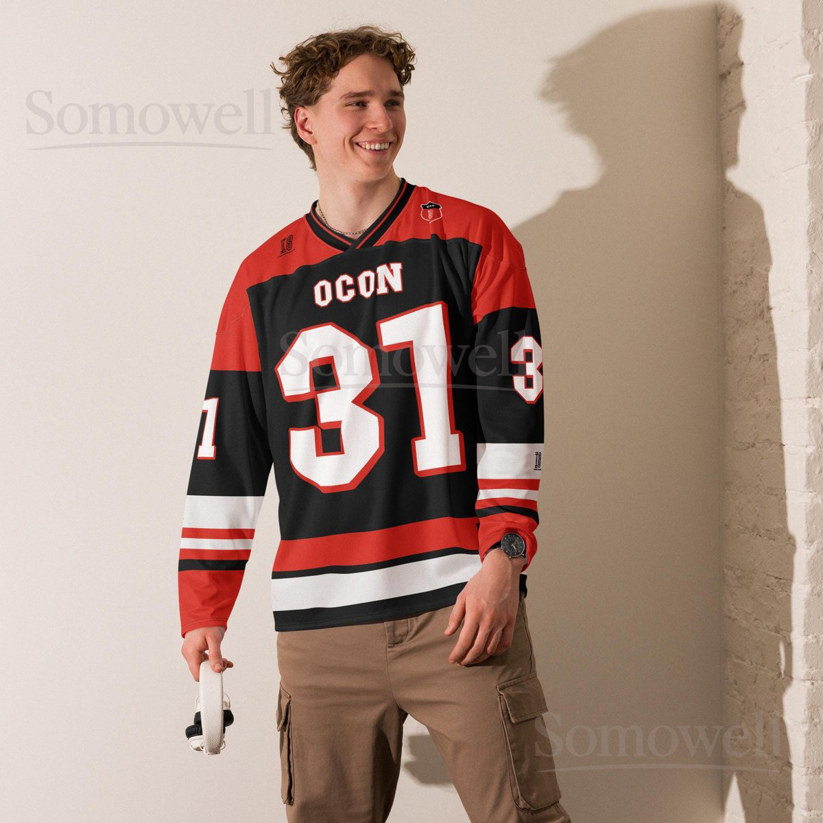 Custom Esteban Ocon Haas F1 Hockey Jersey Shirt for Formula 1 Fans Black and Red Unisex Recycled Polyester Sweatshirt