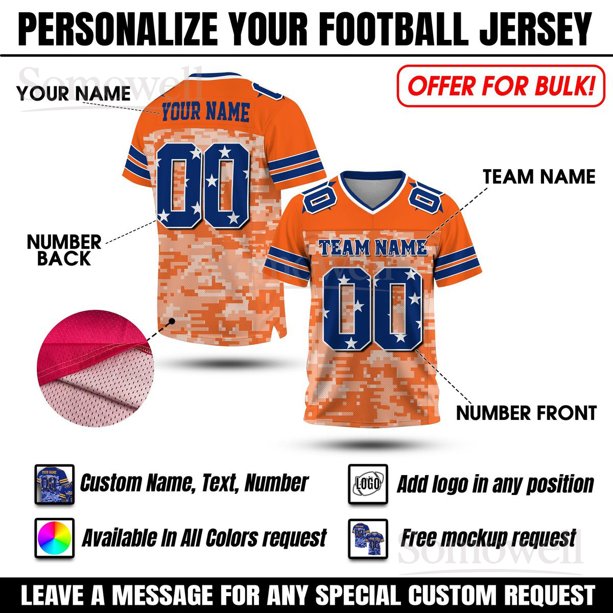 Custom Digital Camo Football Jersey with Team Name and Number Available in Multiple Colors