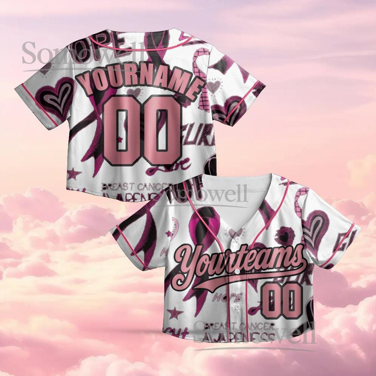 Custom Crop Pink Ribbon Baseball Jersey with Team Name and Number for Breast Cancer Awareness and Support