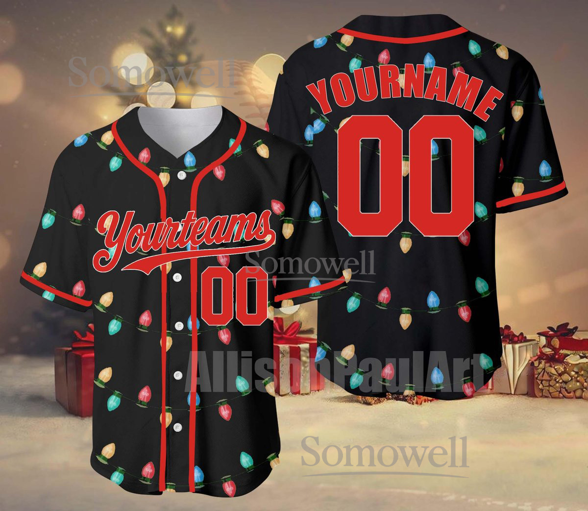 Custom Christmas Lights Baseball Jersey Team Name Number White Festive Edition Available in Multiple Colors