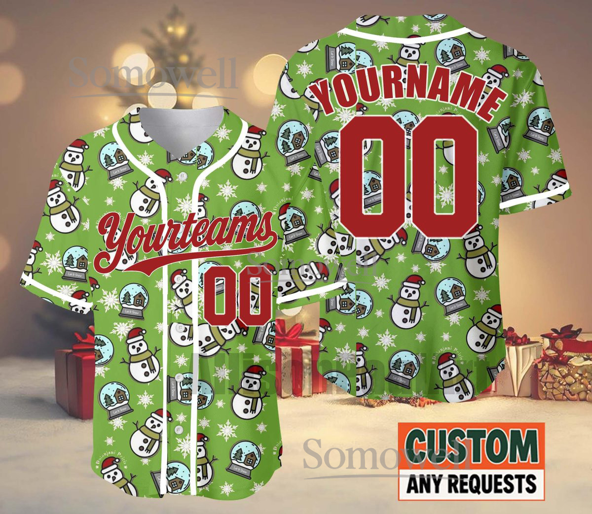 Custom Christmas Baseball Jersey Snow Globe Snowman Edition Available in Multiple Colors