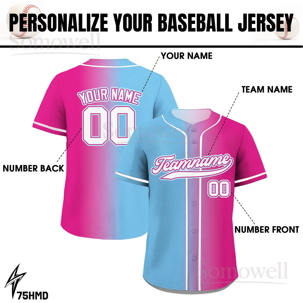 Custom Blue Pink Gradient Baseball Jersey Personalized Team Name Number Softball Uniform Gift for Men Women Youth Multi Color Edition