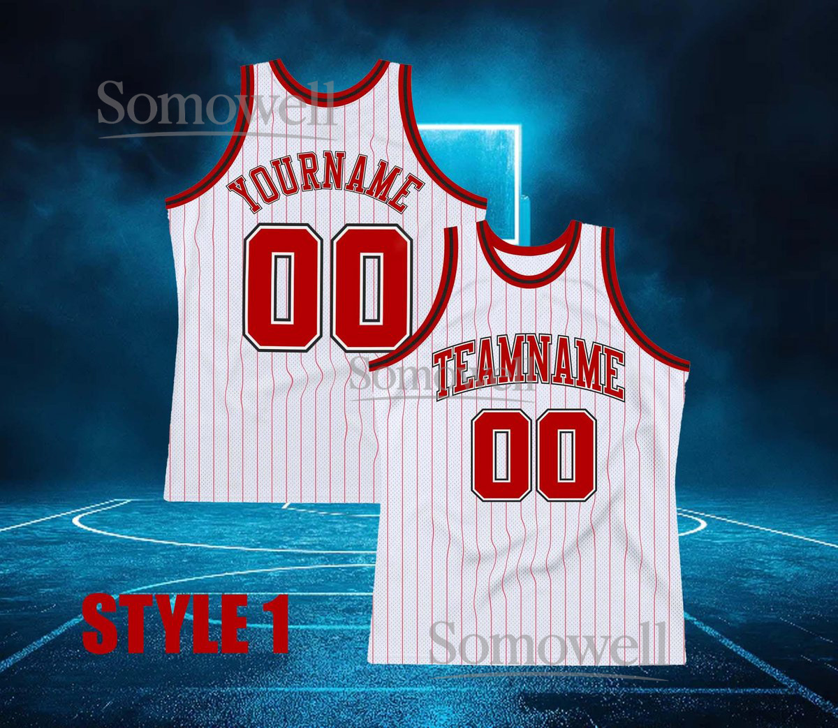 Custom Basketball Jersey Red Black Pinstripe Personalized Team Name Number Sleeveless Top