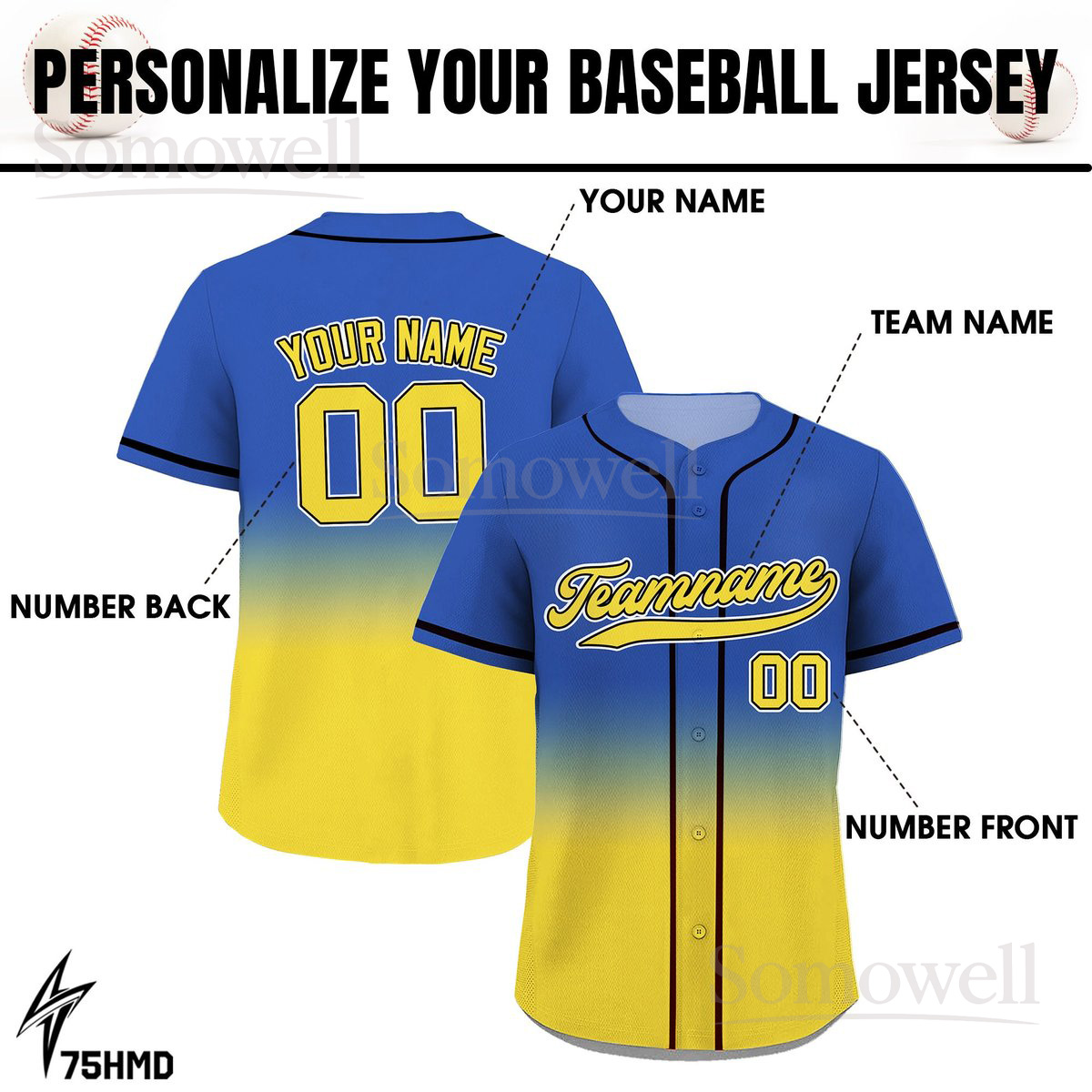 Printed Blue Yellow Gradient Custom Baseball Jersey with Teamname Name Number Multi Color Edition