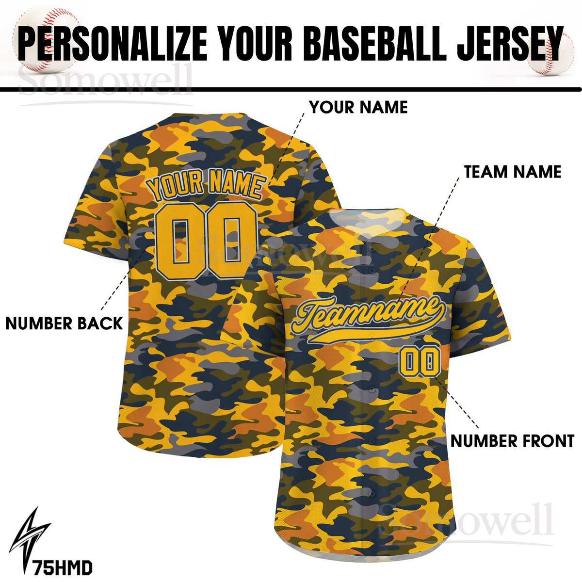 Printed Personalized Yellow Camo Baseball Jersey with Teamname Name Number in Multiple Colors
