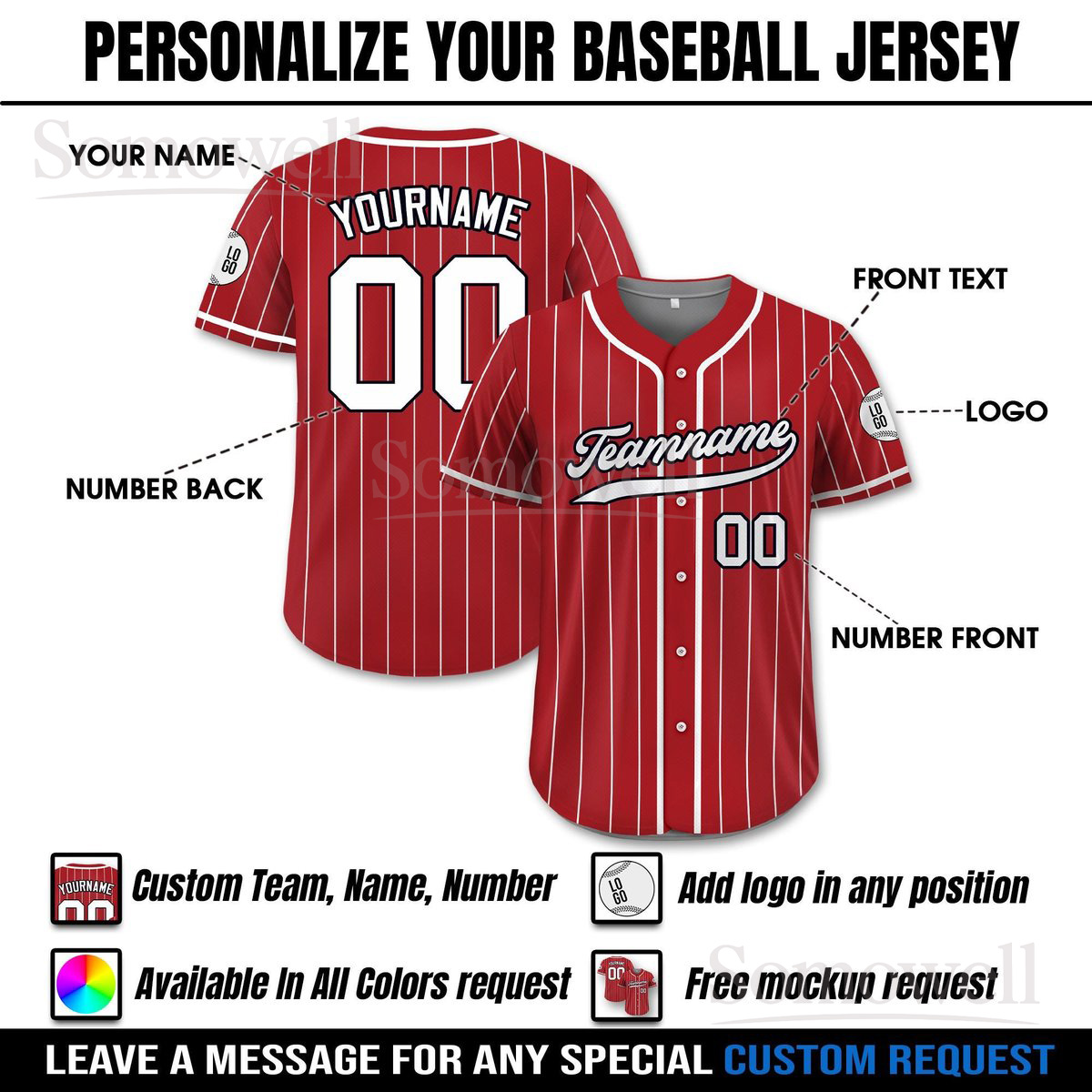 Printed Red White Pinstripe Custom Baseball Jersey with Teamname Name Number Available in Multiple Colors