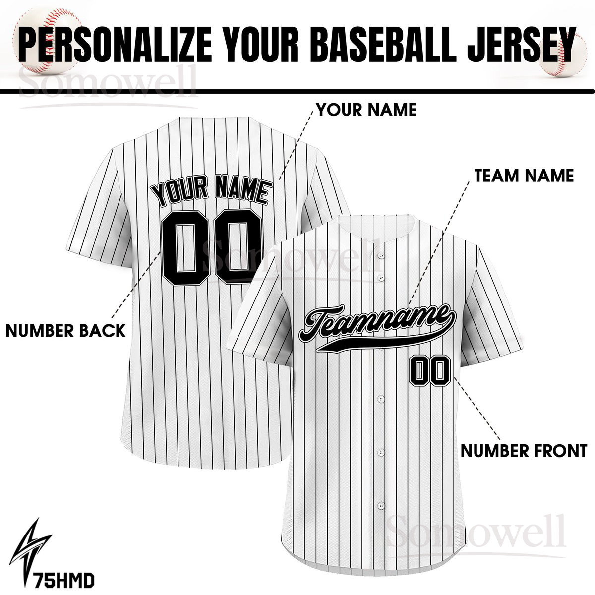 Printed White Black Pinstripe Custom Baseball Jersey with Teamname Name Number in Multiple Colors