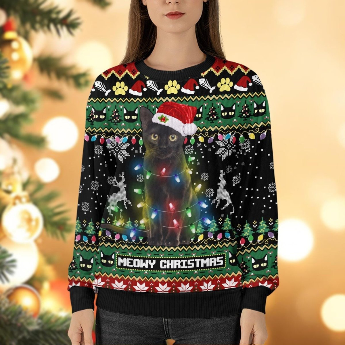 Black Cat Meowy Christmas Ugly Christmas Sweater Funny Cat Lover Gift