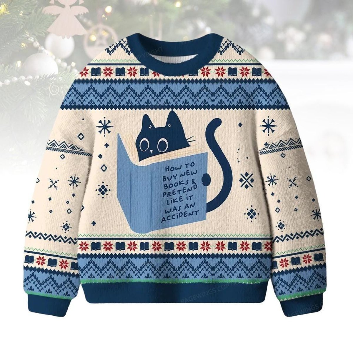 Blue Cat Reading Christmas Ugly Sweater Funny Book Lover Holiday Knit Jumper