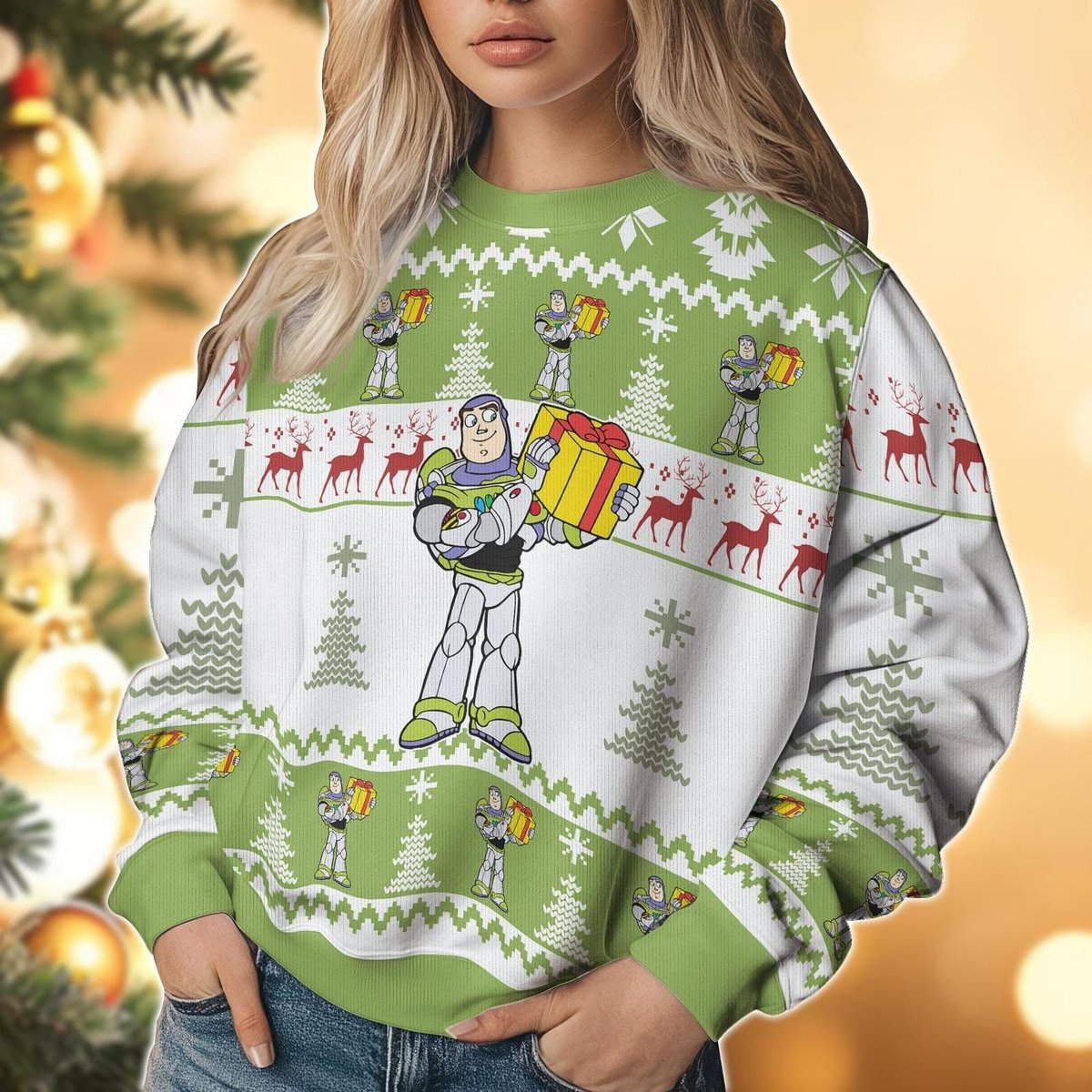 Buzz Lightyear Holding Gift Ugly Christmas Sweater Toy Story Holiday Pullover