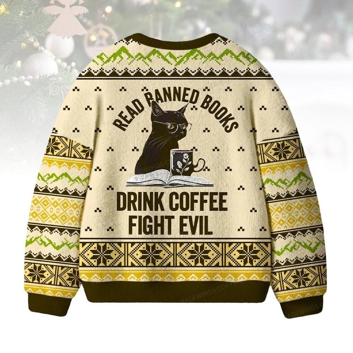 Coffee Cat Christmas Beige Ugly Sweater Read Banned Books Fight Evil Holiday Knit Jumper