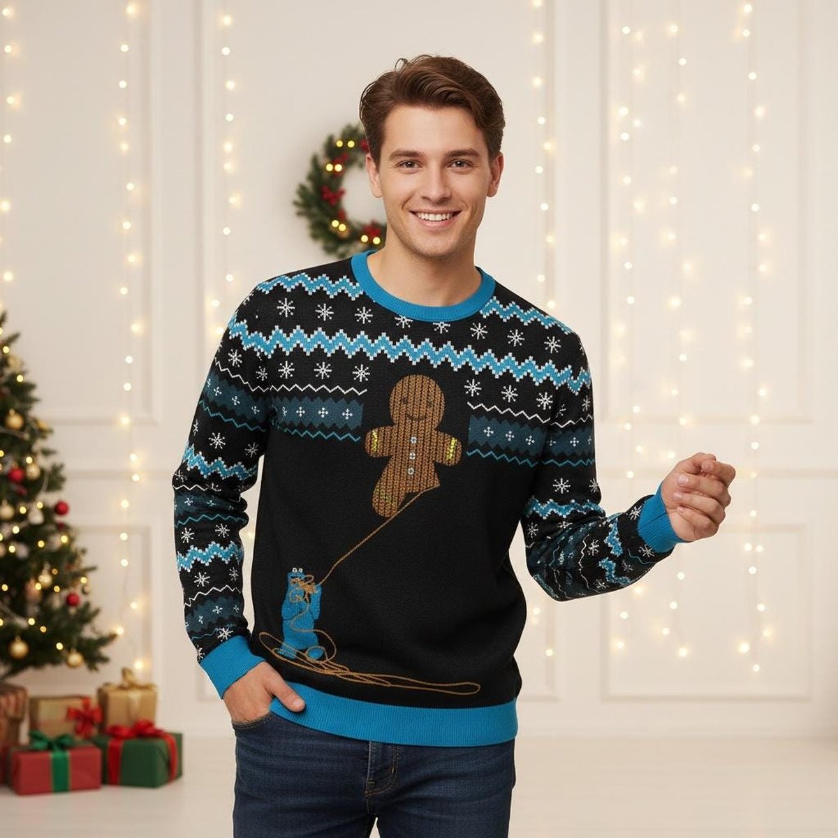 Cookie Monster Christmas Black Ugly Sweater Gingerbread Holiday Blue Knit Jumper