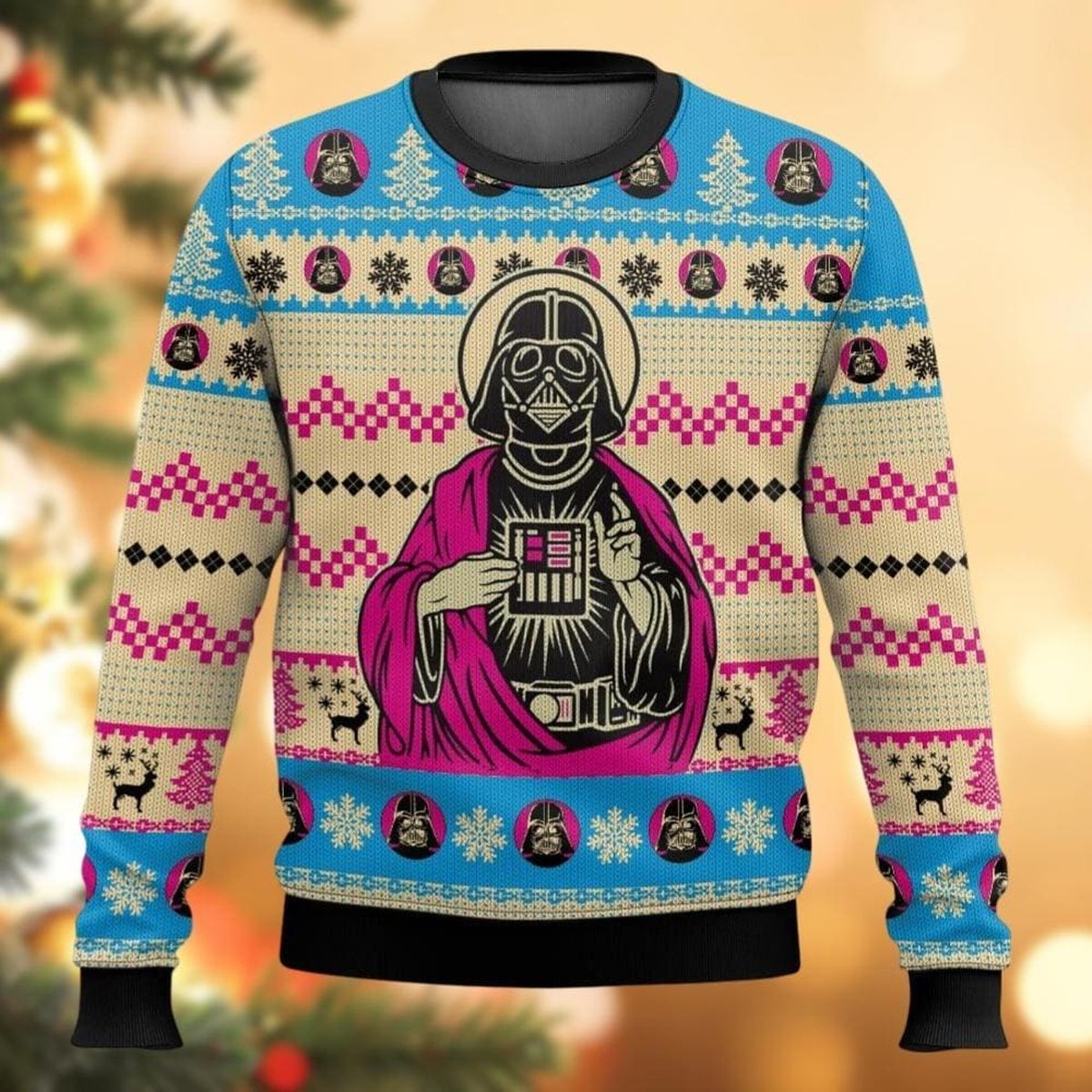 Colorful Darth Vader Jesus Blue Pink Ugly Christmas Sweater Funny Holiday Knit