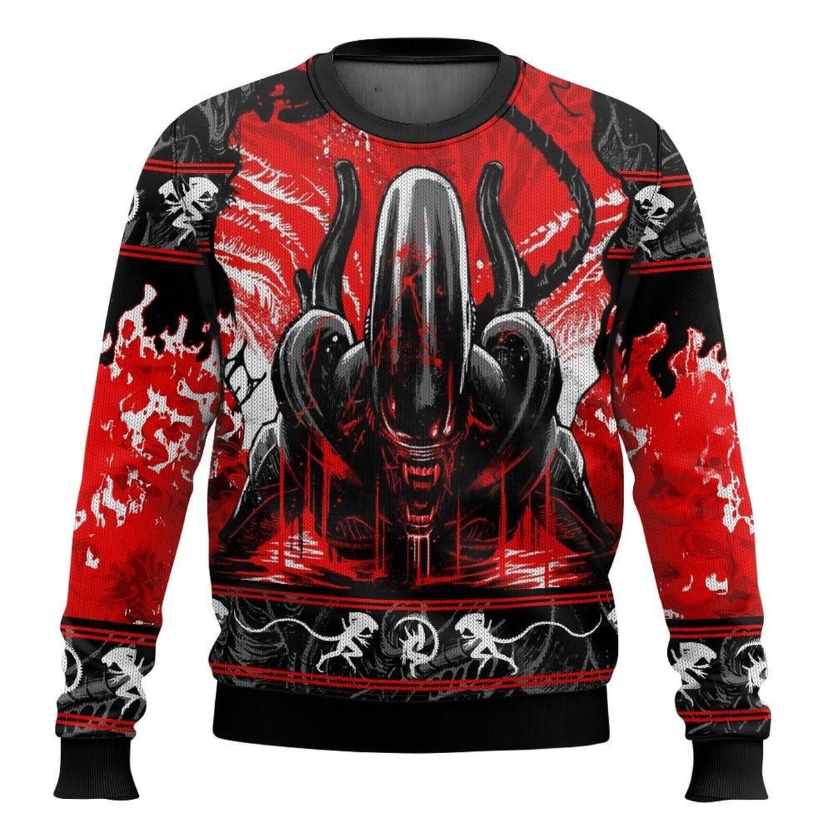 Alien Xenomorph Horror Movie Ugly Christmas Sweater Red Black Sci-Fi Holiday Pullover Gift