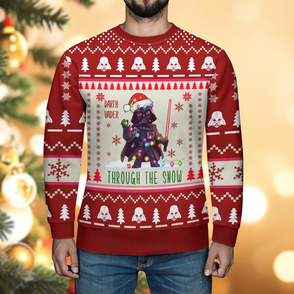 Darth Vader Through The Snow Red Ugly Christmas Sweater Funny Star Wars Holiday Knit Jumper