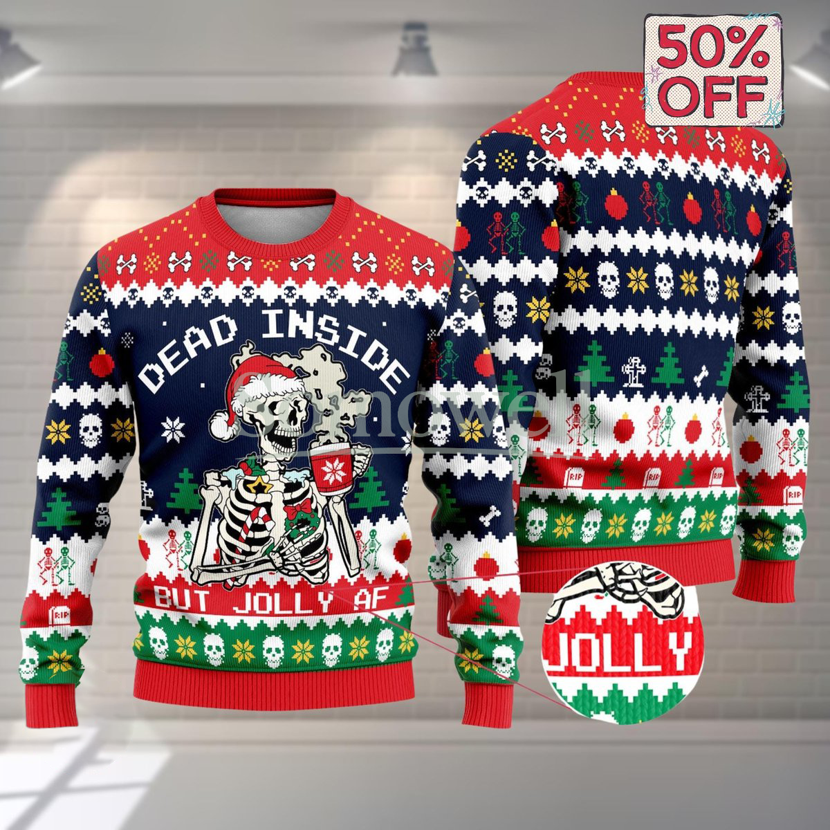 Dead Inside But Jolly AF Red Ugly Christmas Sweater Funny Skeleton Coffee Holiday Knit Jumper