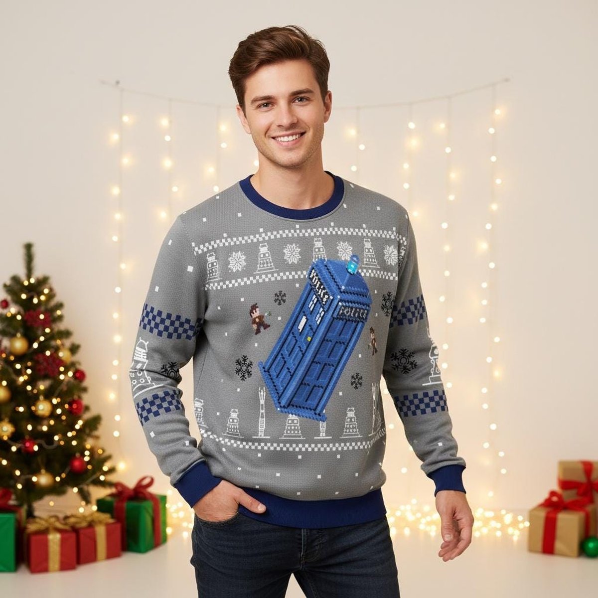 Doctor Who TARDIS Grey Christmas Ugly Sweater Funny Sci-Fi Holiday Knit Jumper