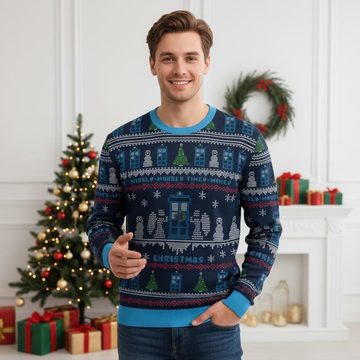 Doctor Who Wibbly Wobbly Timey Wimey Blue Christmas Ugly Sweater Funny Sci-Fi Knit Jumper