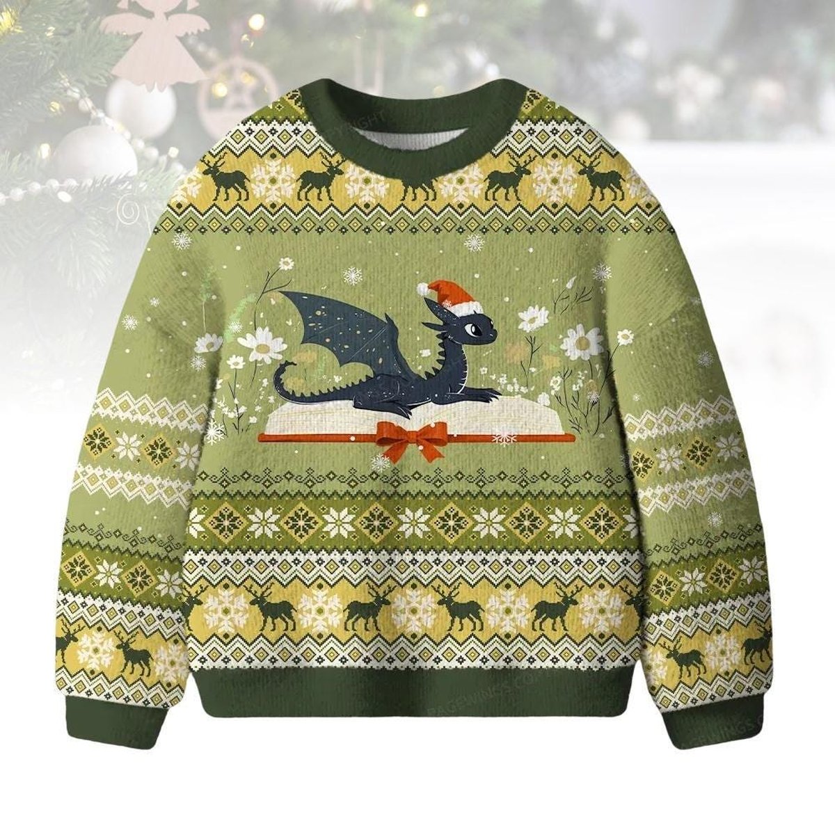 Dragon Bookish Green Ugly Christmas Sweater Cute Fantasy Reading Holiday Knit Jumper