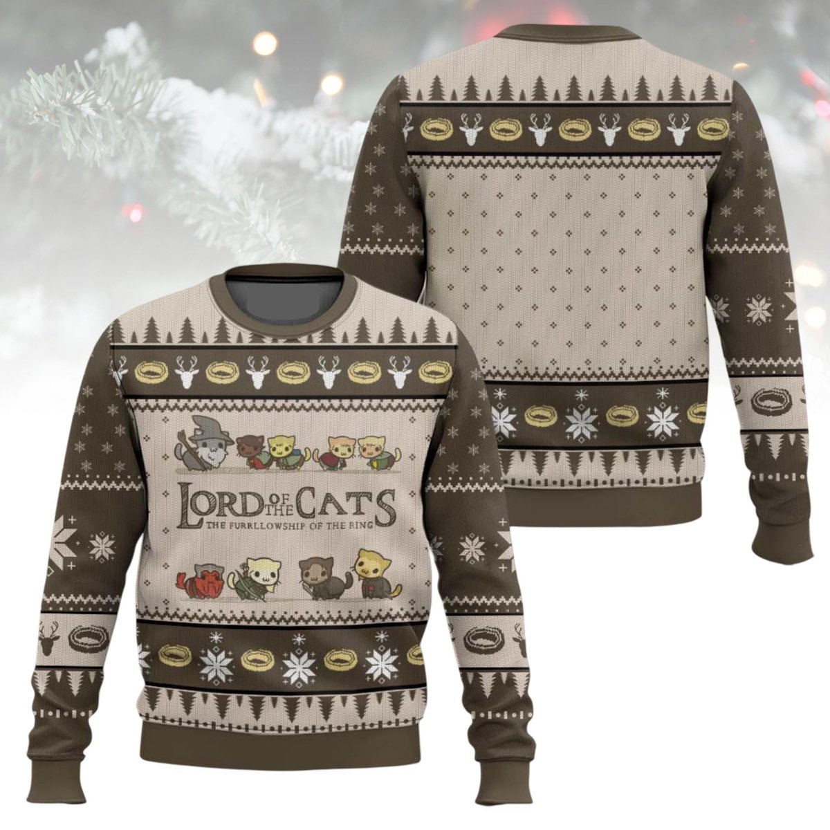 Lord of the Cats The Furrlowship of the Ring Brown Ugly Christmas Sweater Holiday Knit Gift