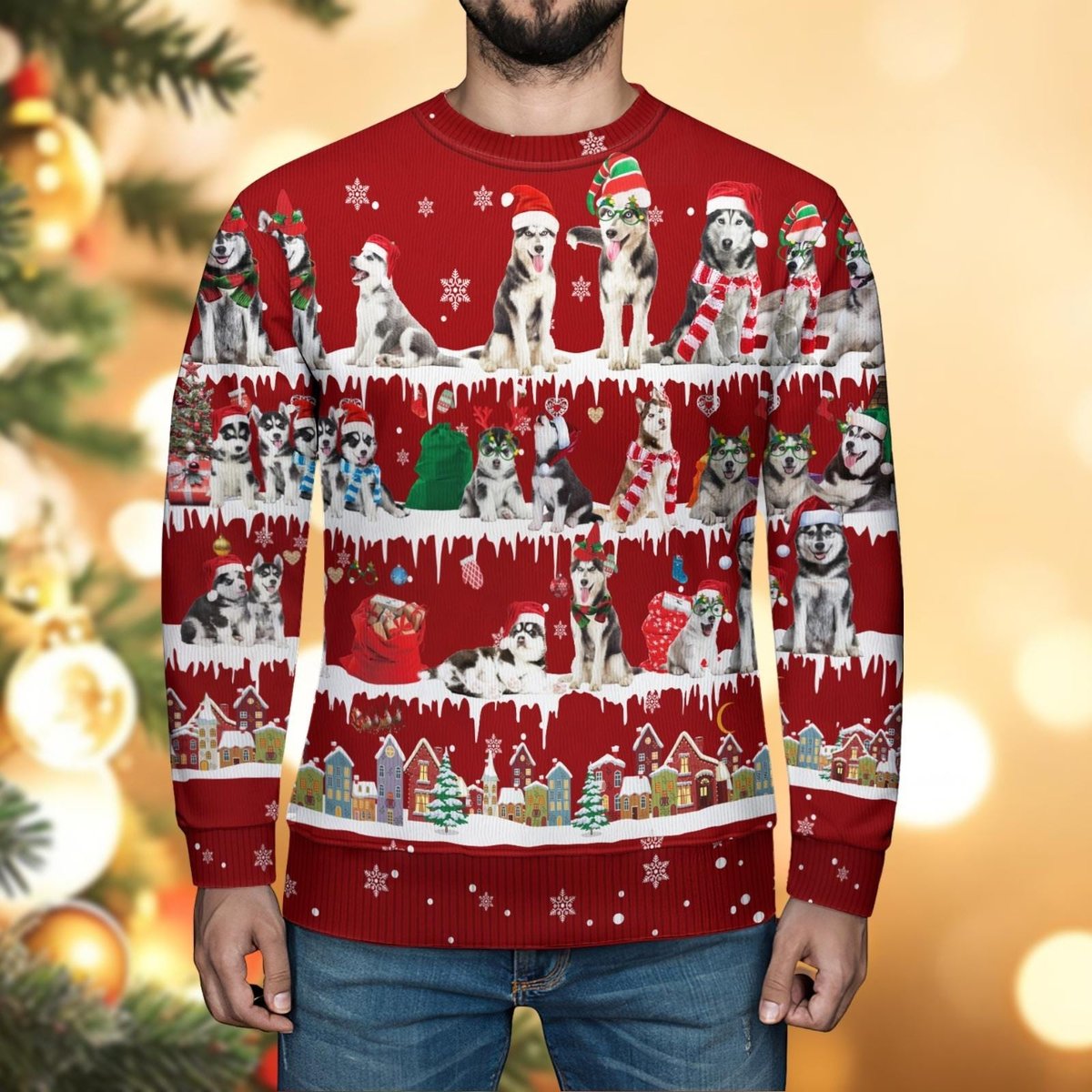 Husky Dogs Christmas Red Ugly Sweater Festive Snowflake Pattern Holiday Cozy Knit Jumper